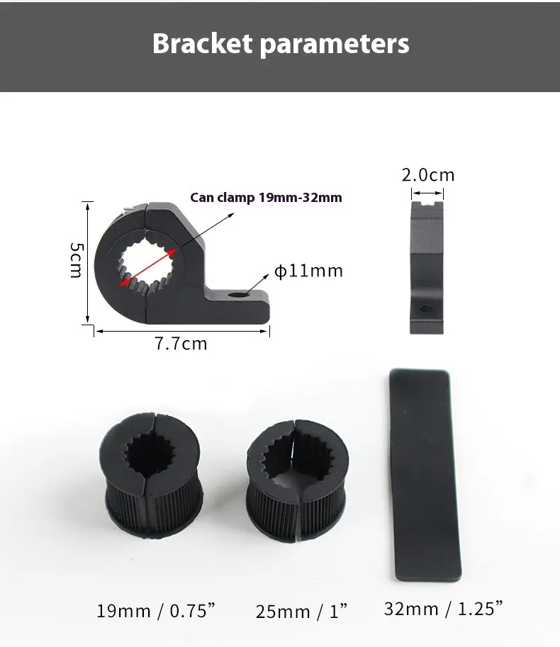The bracket features a durable metal clip with three rubber pads that enhance grip and prevent scratches on handlebars or frames. Its universal design allows it to fit most standard light bars, offering easy adjustment and a solid hold under tough conditions.