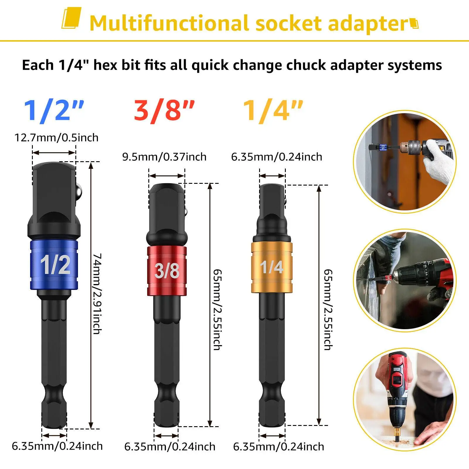 [Drill Socket Adapter and 105° Right Angle Drill Attachment] The package includes 1/4inch, 3/8inch and 1/2inch multifunctional drill socket