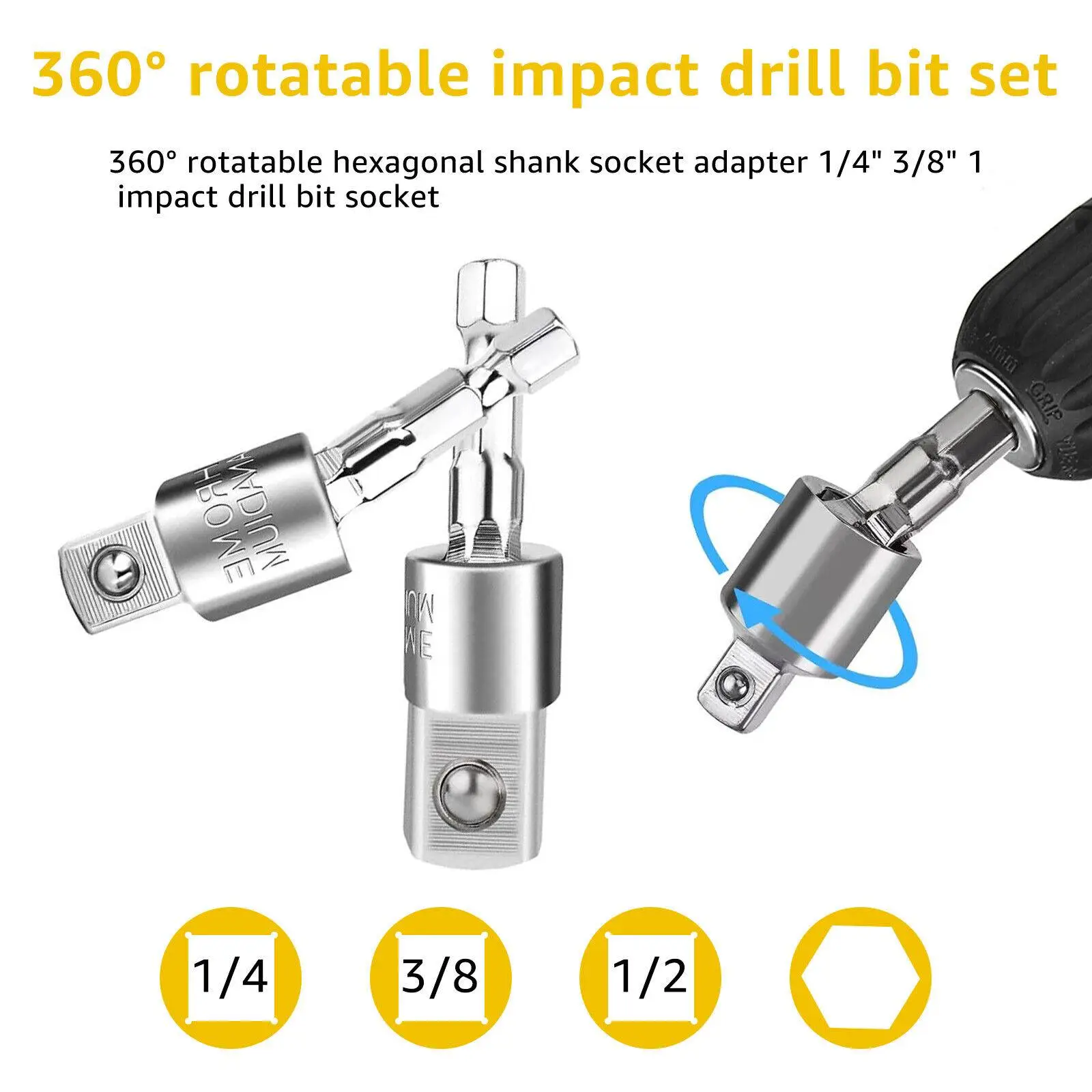 [360° Rotatable Impact Drill Bit] The 360° rotatable hexagonal shank socket adapter 1/4inch 3/8inch 1/2inch impact drill bit socket adopts a