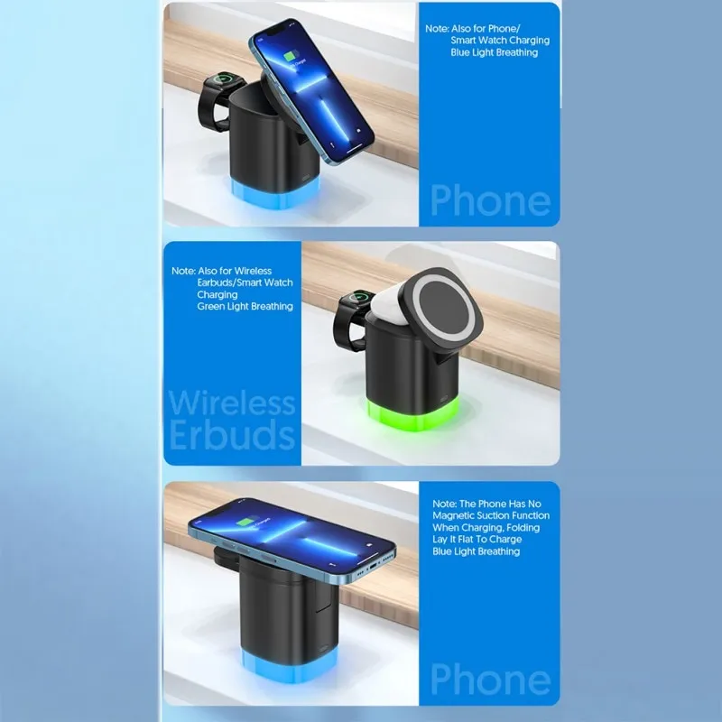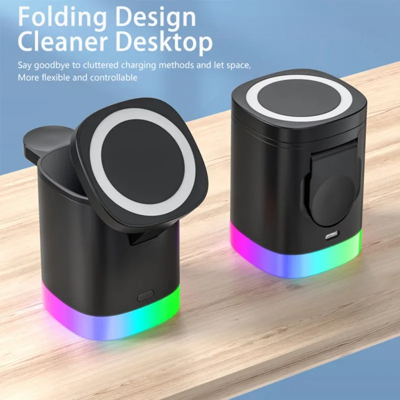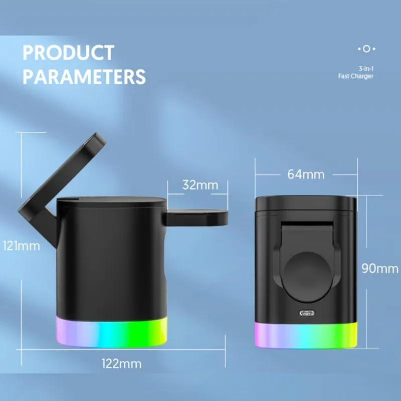 Adding to its appeal, the dock features a smart RGB ambient breathing light that changes colors while charging—bringing both style and functionality to your desktop or nightstand. Built with high-quality ABS+PC materials and 80%+ charging efficiency, this wireless charging station is universally compatible with all Qi-enabled devices. It's a must-have gadget for tech lovers and minimalists alike.