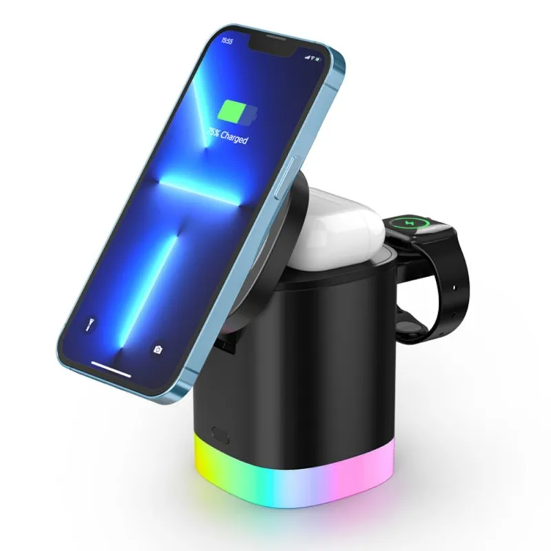 Adding to its appeal, the dock features a smart RGB ambient breathing light that changes colors while charging—bringing both style and functionality to your desktop or nightstand. Built with high-quality ABS+PC materials and 80%+ charging efficiency, this wireless charging station is universally compatible with all Qi-enabled devices. It's a must-have gadget for tech lovers and minimalists alike.