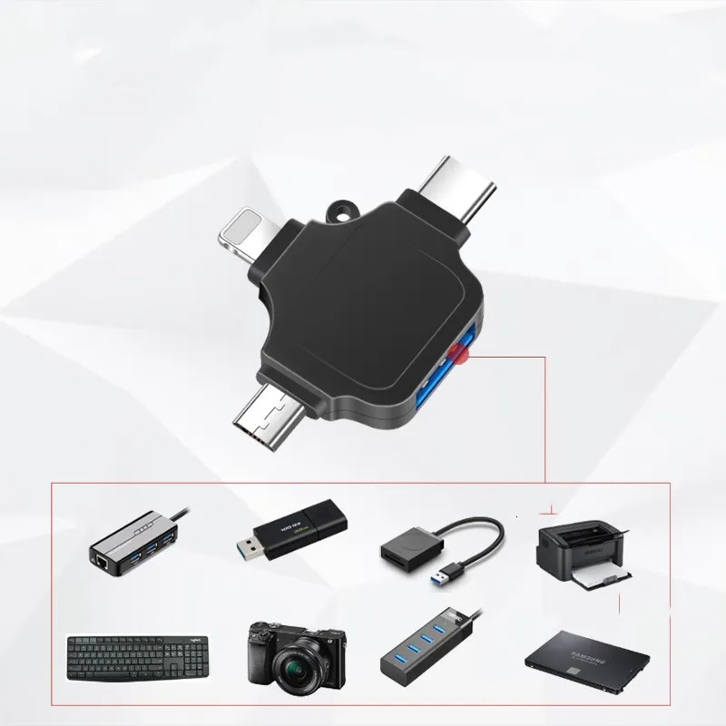 Simplify your connectivity with the Three-in-One OTG Adapter, compatible with Apple Lightning, Type-C, and Android Micro USB devices. This upgraded multi-function OTG connector is equipped with the reliable 3959 original chip, ensuring stable and high-speed reading when transferring photos, videos, and files between smartphones, tablets, and U disks.