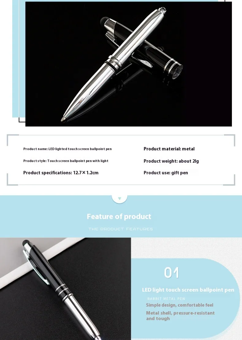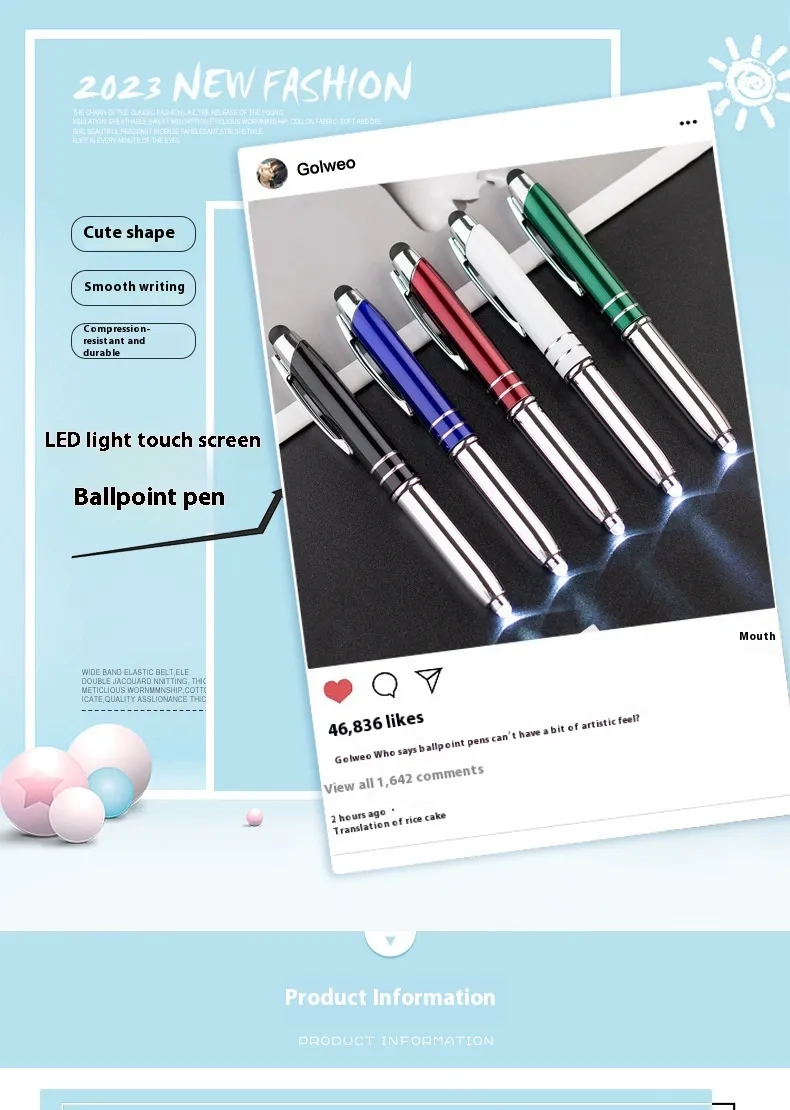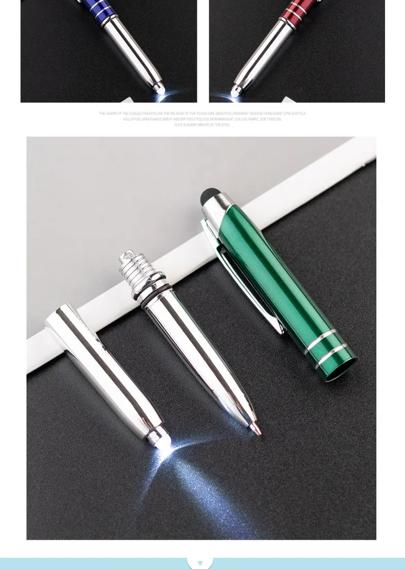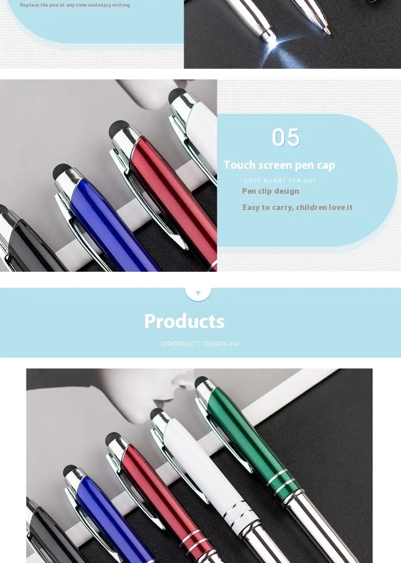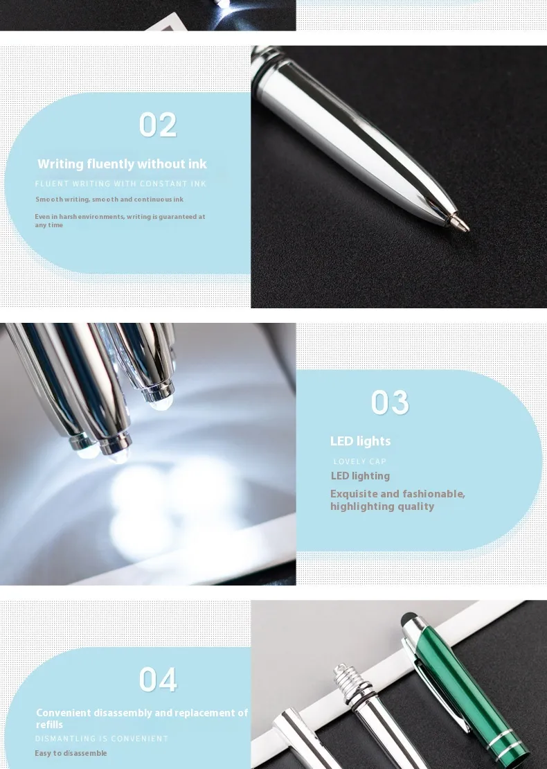 Upgrade your everyday writing tool with this Multifunctional Metal Ballpoint Pen, combining a capacitive stylus, bright LED light, and smooth bullet-tip ballpoint pen in one sleek design. Whether you're taking notes, navigating your touchscreen, or working in low light, this all-in-one pen gets the job done.