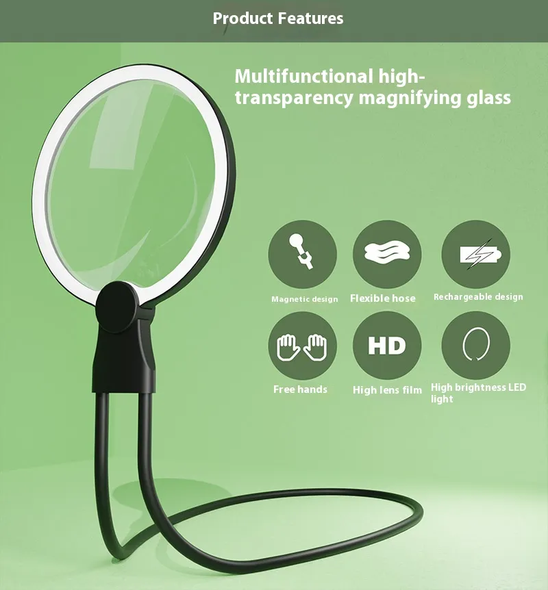 Equipped with 24 bright white LED lights, this magnifier ensures even illumination across the viewing area. The flexible silicone hose allows easy angle adjustment, making it convenient to position the light exactly where needed. Its slim structure and modern design make it suitable for desks, worktables, and professional environments.
