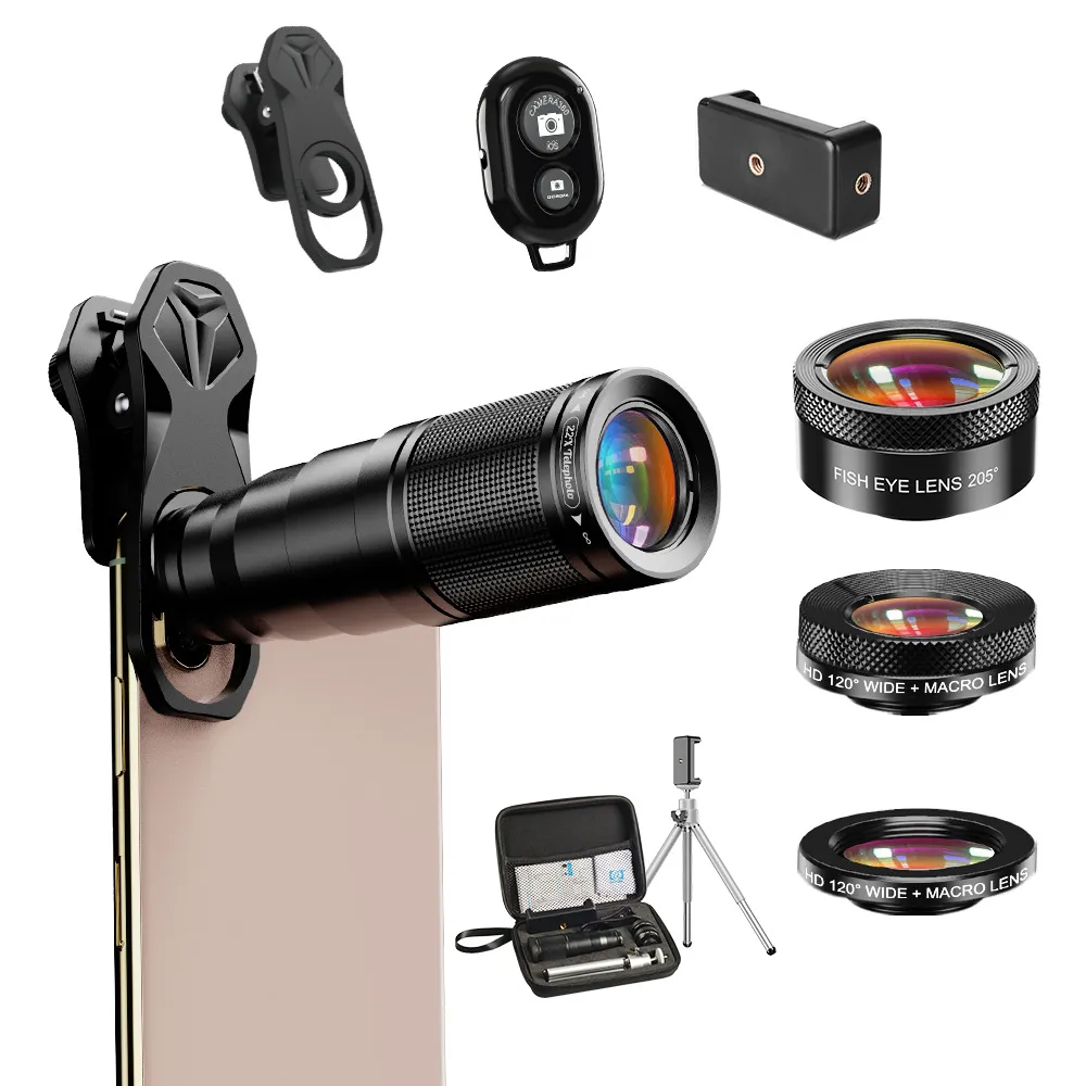 Featuring the APEXEL-22X105-4IN1 monocular telescope lens, this set includes everything you need: a 22X telephoto lens for zooming in on distant subjects, a wide-angle lens for capturing more in the frame, a fisheye lens for creative distortion, and a macro lens for crisp close-up details. The universal clip ensures compatibility with most iPhone and Android models.