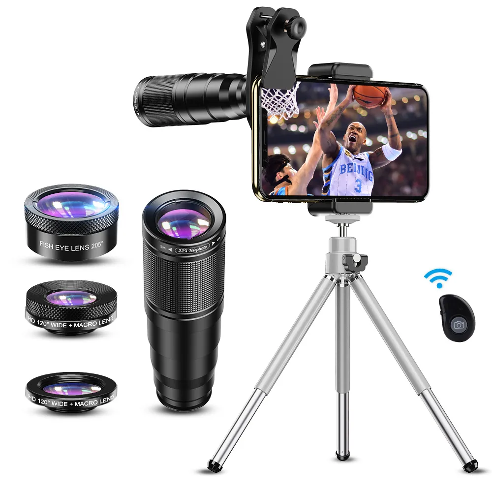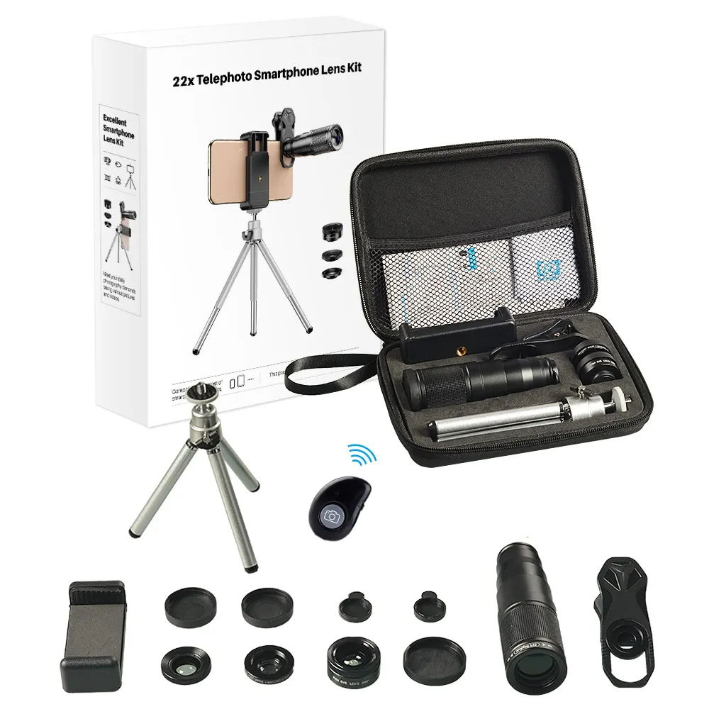 4-in-1 Mobile Phone Camera Lens Set – 22X Telephoto, Fisheye, Wide-Angle & Macro with Tripod & Clip Mount