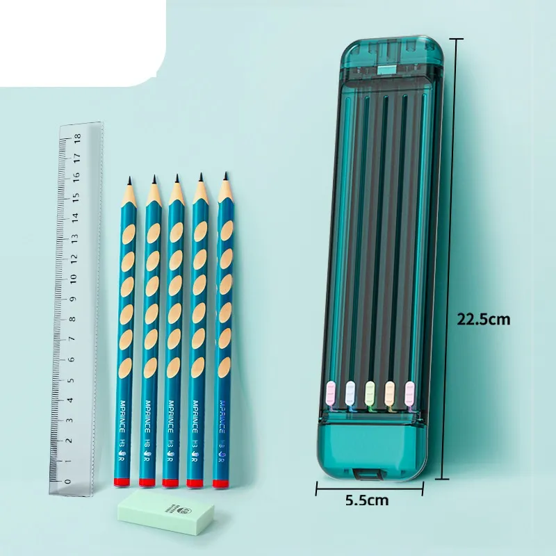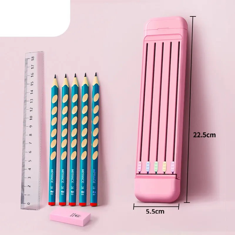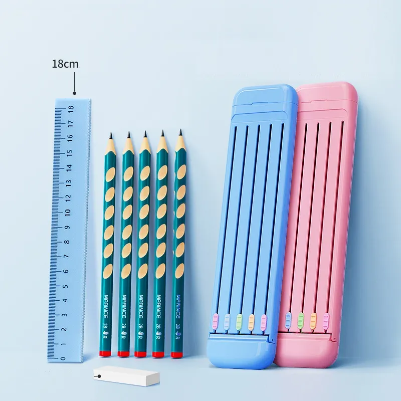 Keep school essentials organised with the 4-Piece Stationery Box Creative Pencil Case with Ruler, Eraser & 5 Pencils for School Kids. This minimalist, practical pencil box is designed for primary school students, featuring individual pen slots to keep each pencil neatly in place for easy access and tidiness.