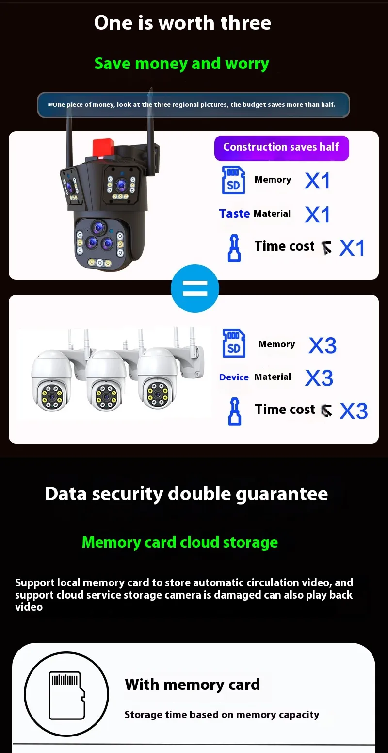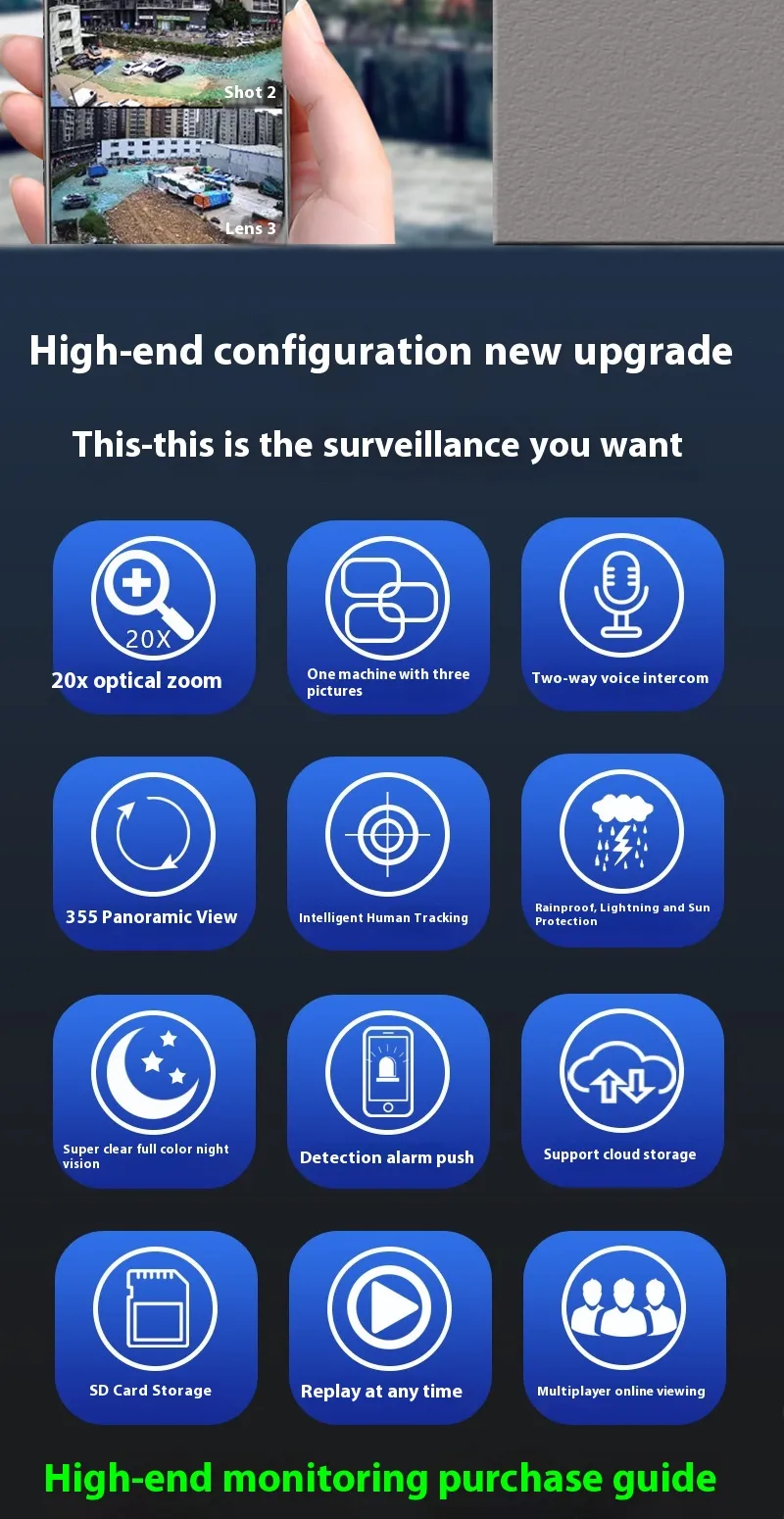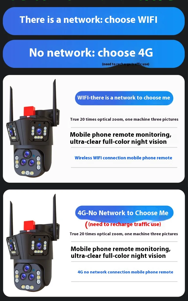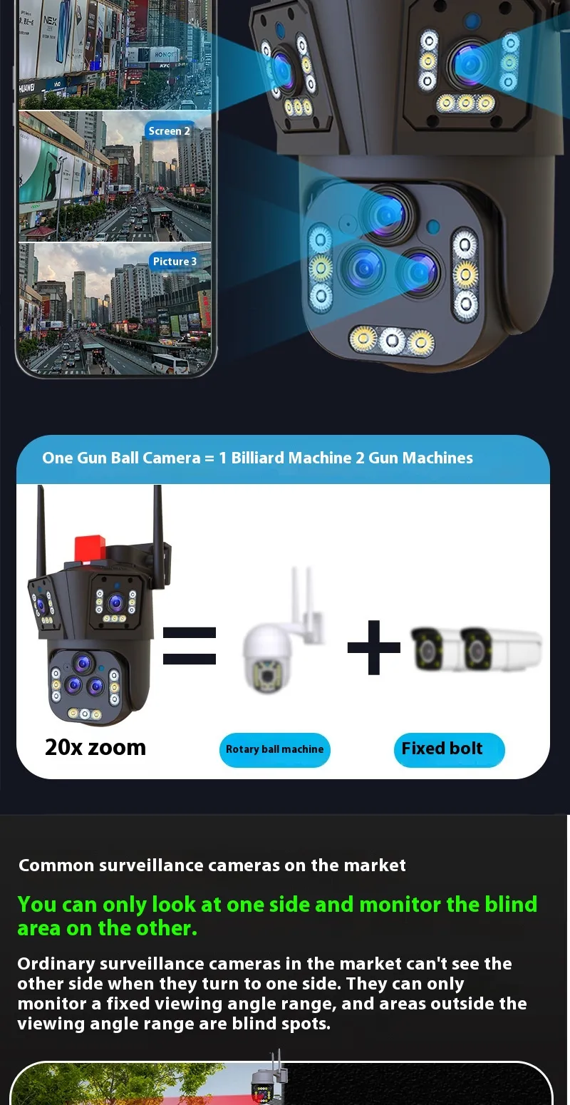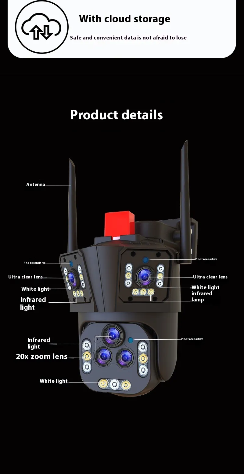 Equipped with a powerful 20X zoom lens and WiFi connectivity, this surveillance camera delivers crisp, detailed footage. The three-screen display provides wide coverage and flexible viewing options, while the included 15-day storage card ensures secure video recording without the need for constant maintenance.