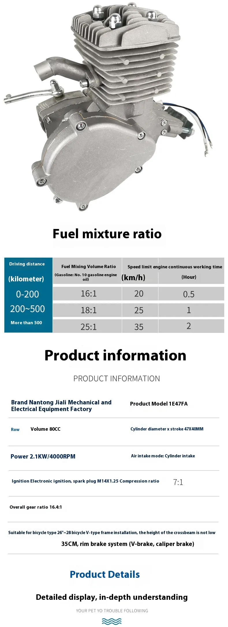 The 1E47FA single-cylinder, air-cooled two-stroke gasoline engine delivers strong and stable performance, perfect for daily use or fun weekend projects. Its 47x40mm cylinder stroke and compression ratio of 7:1 ensure powerful acceleration and smooth operation. The 16.4:1 gear ratio provides optimal torque and efficiency for all road conditions.