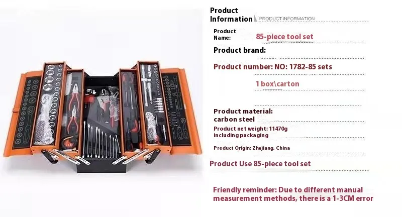 Tackle any repair job with this 85-piece auto repair kit, neatly organized in a durable three-layer toolbox. Designed for both household and automotive use, this complete toolkit ensures you always have the right tool at hand.