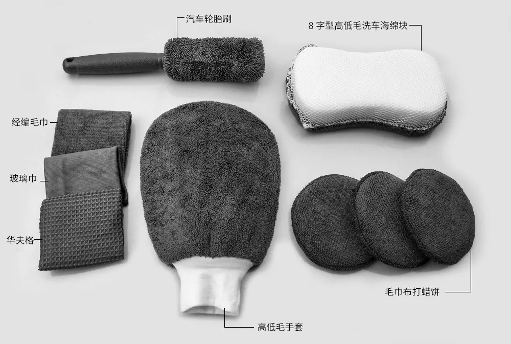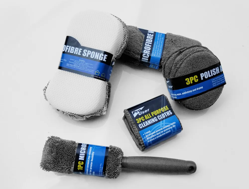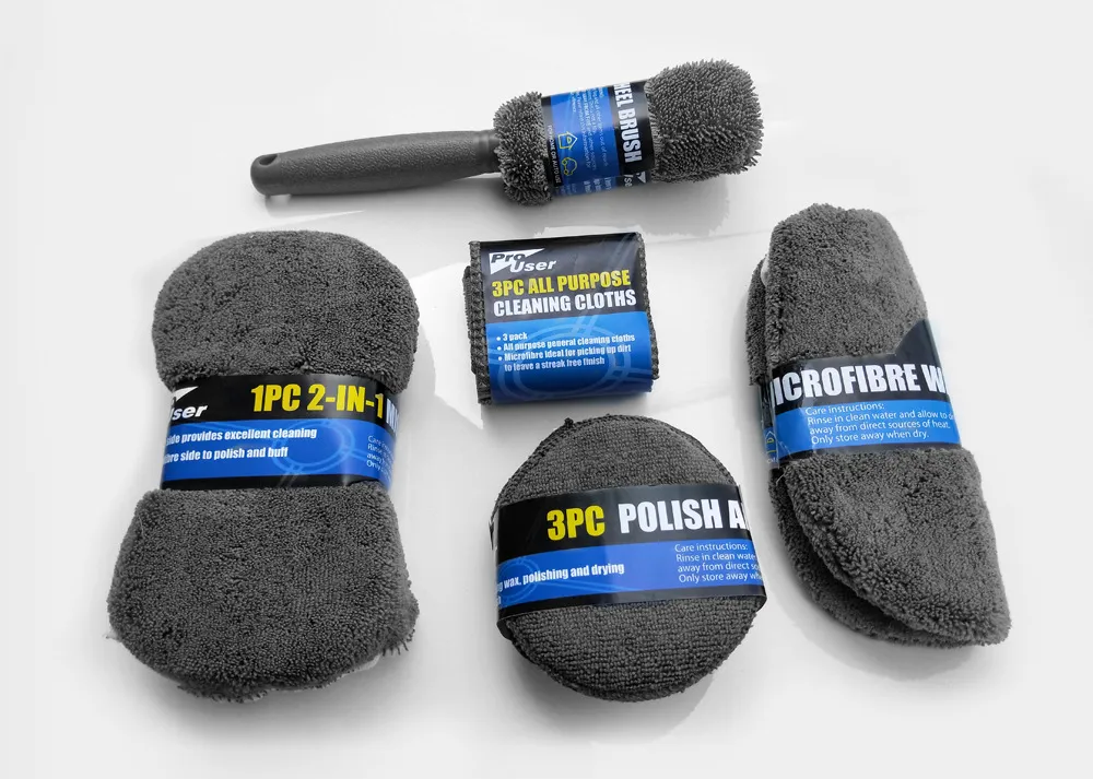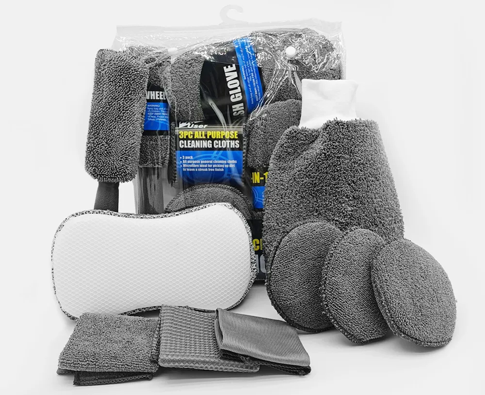 Available in gray, orange, and multicolor variations, the set features essentials like waxing sponges, microfiber cloths, and a wheel hub brush—perfect for tackling tough dirt on tires, body panels, glass, and even interior surfaces. The high-quality microfiber effectively lifts dust and water, while the included brush helps deep-clean wheel crevices and rims with ease.