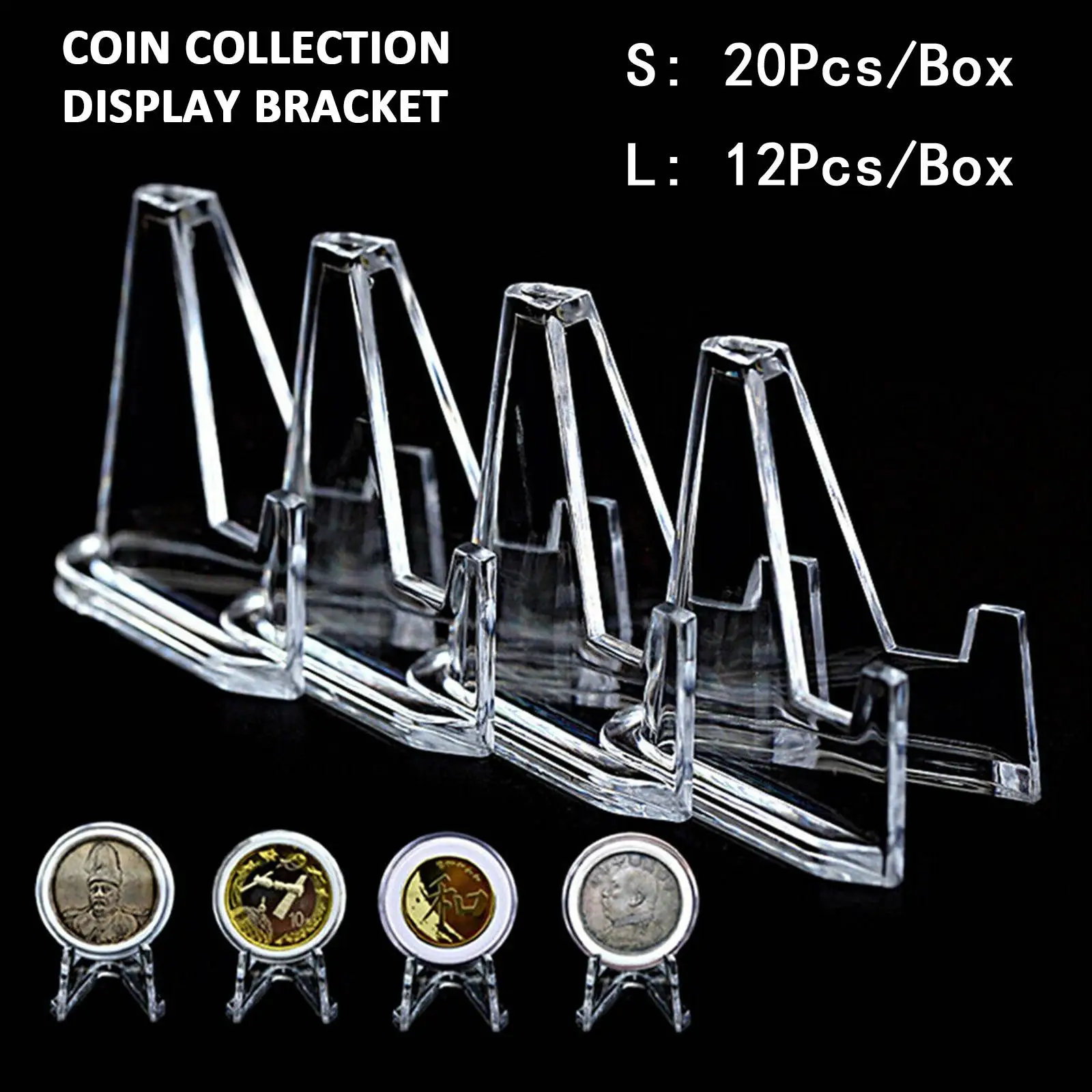 Available in two sizes – Small (20pcs/box) and Large (12pcs/box) – these brackets are perfect for displaying coins, medals, collectible cards, tokens, or small memorabilia. The sturdy base and angled support ensure your items are always displayed upright, making them ideal for shelves, showcases, desktops, or exhibitions.