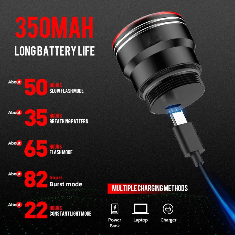 Equipped with efficient COB LED lamp beads, the light produces over 60 lumens for bright and clear illumination. Multiple modes, including slow flash, breathing, fast flash, and burst flash, allow riders to customize visibility according to road conditions or personal preference. The built-in 3.7V/350mAh lithium battery ensures long-lasting performance and convenient USB charging.