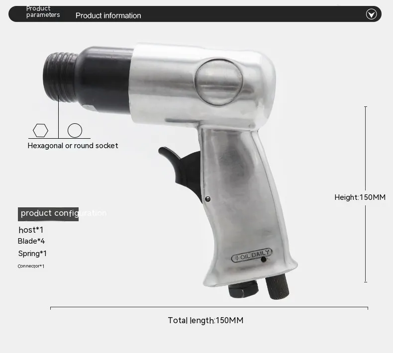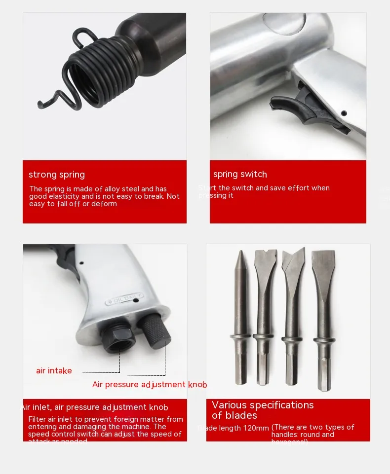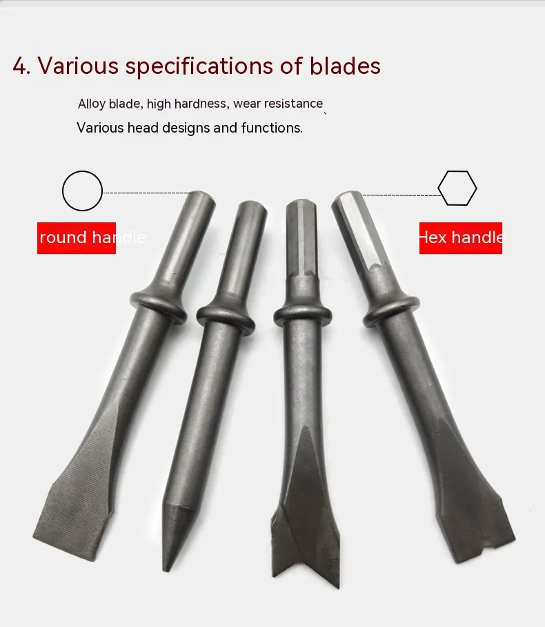 This versatile tool comes in hexagonal and round handle suits, offering compatibility with various chisel heads for multiple uses. Ideal for mechanics, workshops, and tire repair professionals, it delivers reliable performance for breaking, cutting, and surface cleaning.