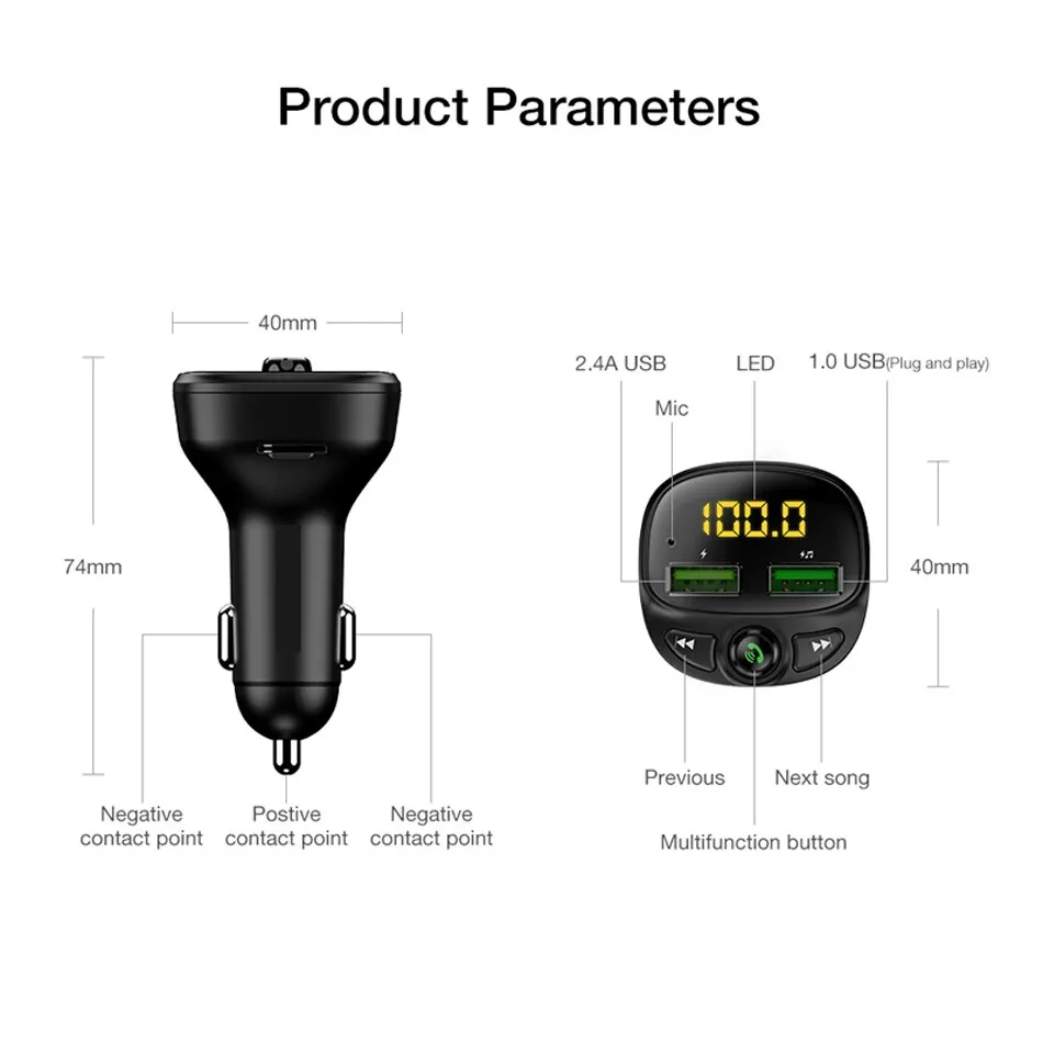 Powered through the cigarette lighter (12V–24V DC), this compact device features a 1.1-inch LED display, FM radio function, and QC3.0 fast-charging compatibility. With its sleek design and 85dBA signal-to-noise ratio, it’s the ultimate blend of convenience, performance, and style for any vehicle.