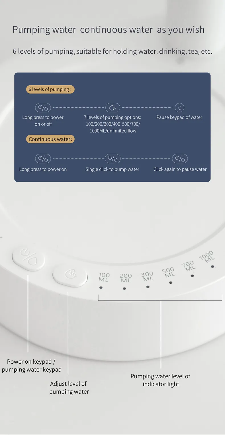 Powered by a built-in 1800mAh rechargeable battery, the Automatic Bottled Water Dispenser offers long-lasting use between charges. Compatible with standard water bottles, it provides a convenient, mess-free way to access clean drinking water. Its sleek ABS plastic housing in white or black blends seamlessly with modern kitchen or office decor.