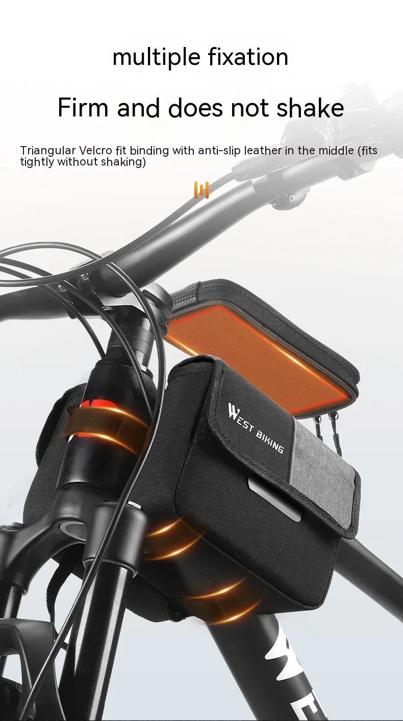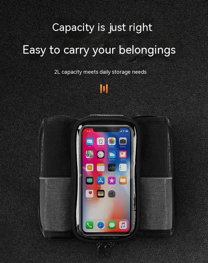 Stay equipped and connected on every ride with this Bilateral Tube Saddle Bag featuring a touchscreen-compatible phone pocket. Designed to fit securely on the top tube of most bicycles, this functional storage bag offers easy access to your essentials while keeping your phone visible and usable during your ride.