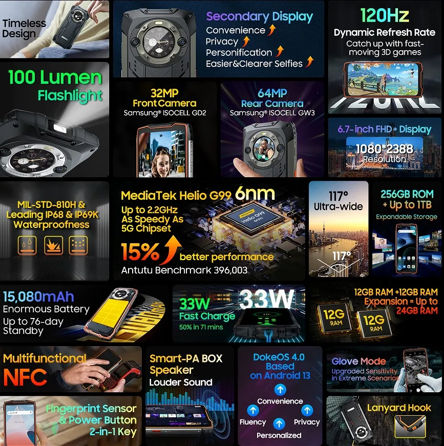 Certified IP68 waterproof, dustproof, and shockproof, and made from rugged plastic materials, the BV9300 Pro is ready for extreme environments. It runs on Android 13, supports GPS, NFC, face unlock, and is available in Green, Orange, and Black. This smartphone is more than just tough—it’s smart, fast, and made for people on the move.