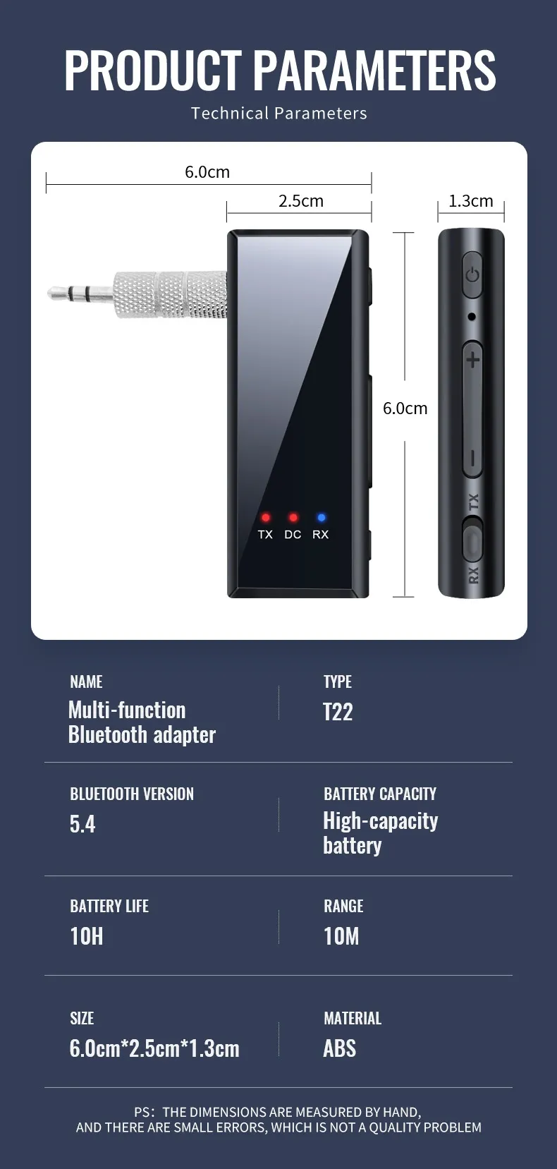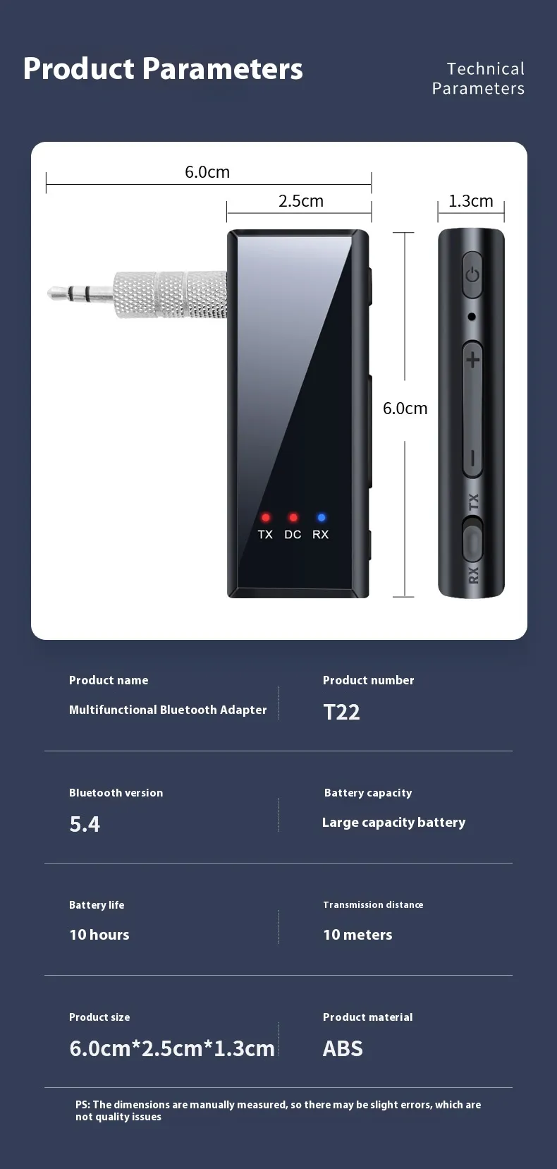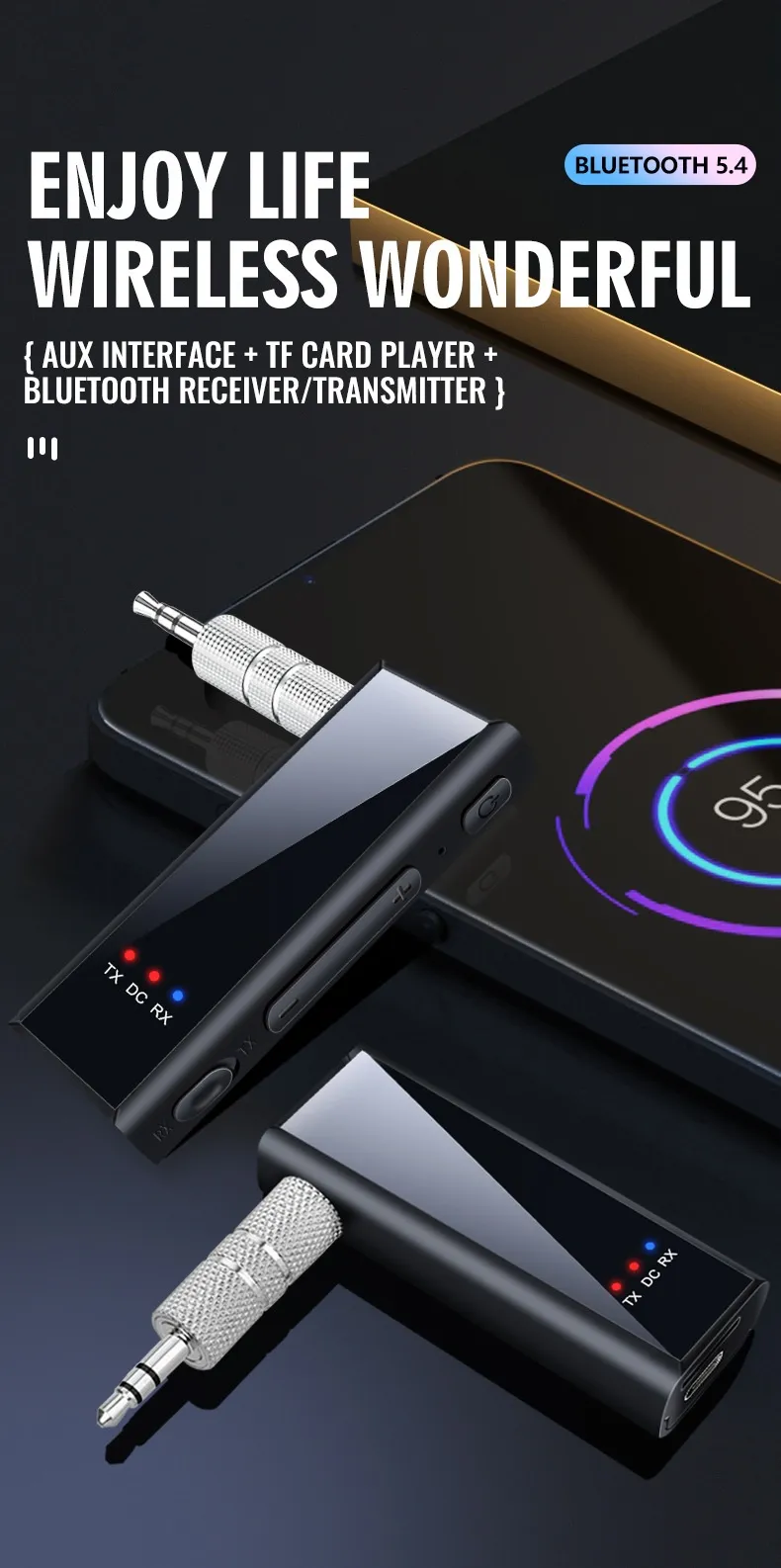 Enjoy seamless wireless audio with the Bluetooth 5.4 Audio Adapter. Designed with a 3.5mm interface, this two-in-one device works as both a receiver and transmitter, making it ideal for upgrading your car stereo, headphones, or home speaker system. Its compact, plug-and-play design ensures easy use without the need for an external power supply.