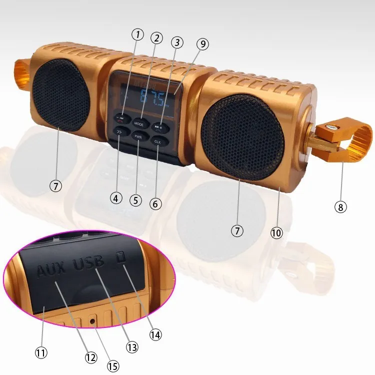 This high-performance audio unit operates on 12V power, making it perfectly compatible with most motorcycle models. Available in elegant Golden, Silver, and Red Square styles, it combines a sleek design with durable construction to withstand vibrations, weather, and daily wear.
