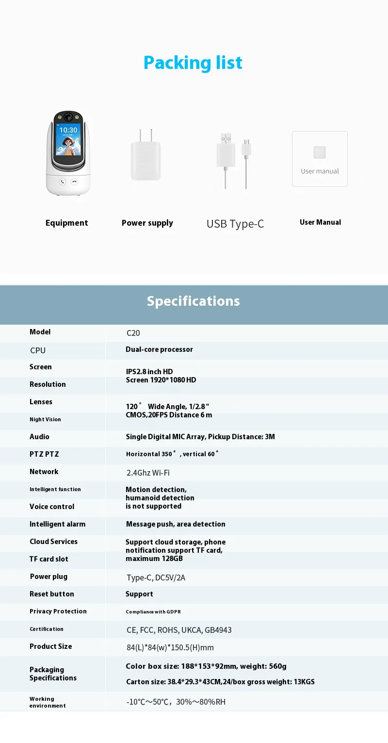 Compact yet powerful, the device measures 85×85×153mm, and comes with a USB Type-C cable for efficient charging. Built with advanced technology and a user-friendly interface, the C20 is ideal for families, remote monitoring of loved ones, or as a reliable home security device with built-in screen communication.