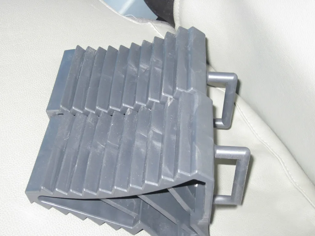 Scientific design: This wheel skid stop utilizes the scientific principle of stability in triangles, combined with the different shapes of