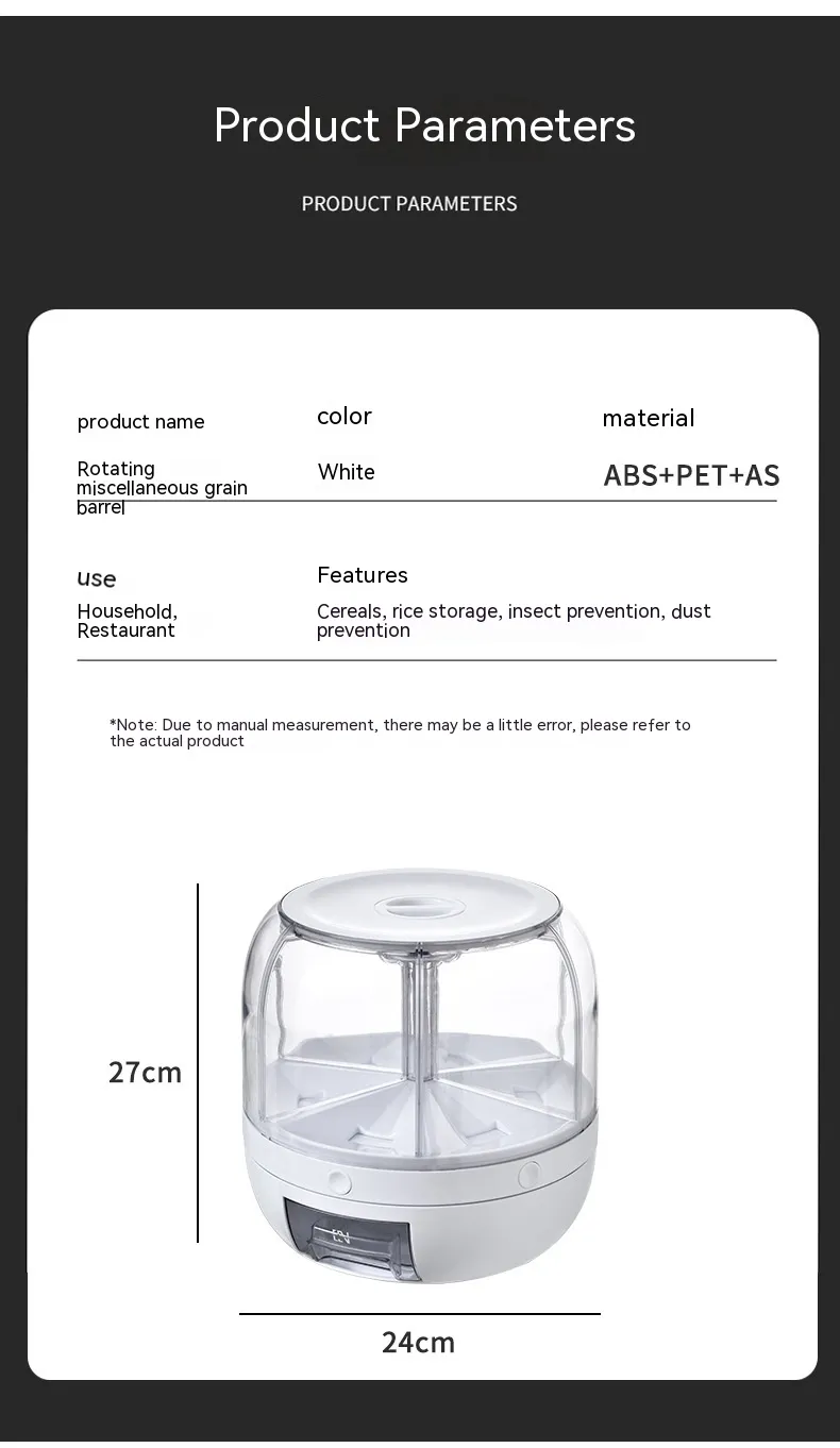 Perfect for storing rice, oats, beans, pasta, and more, this multi-compartment cereal storage box is a practical solution for both large and small kitchens. Its modern, minimalist style fits any décor, while the large capacity ensures fewer refills and more convenience. Upgrade your food storage system with this versatile, easy-to-clean rotating sealed grain container and enjoy fresher, more organized kitchen staples every day.