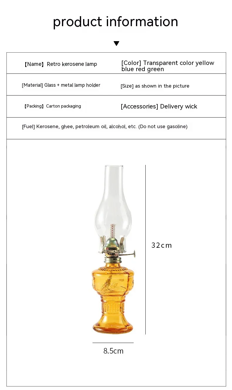 Bring timeless charm to your home or outdoor space with this Classic Retro Glass Oil Lamp. Available in transparent, red, green, blue, and tea yellow, it adds a warm, nostalgic glow to any setting. Its vintage design complements traditional décor while serving as a functional light source.