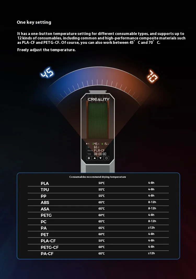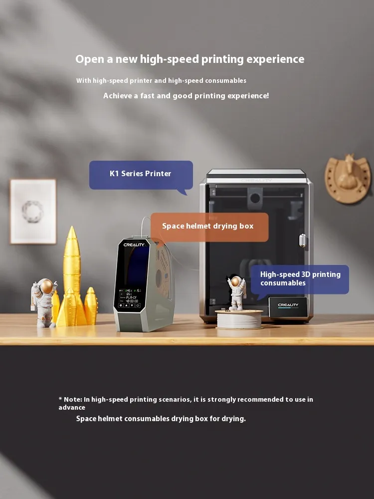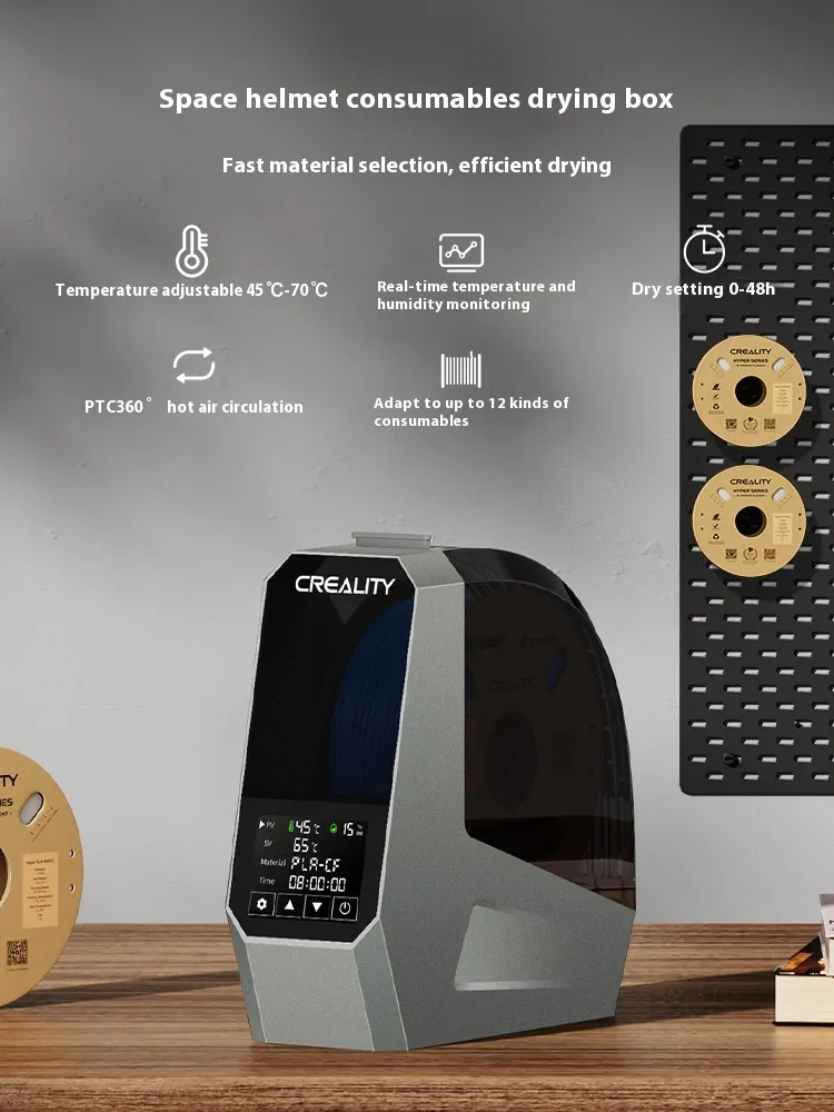 Compatible with a wide range of filament materials (PLA, ABS, PETG, TPU, etc.), the box offers moisture-proof storage and real-time temperature regulation to keep your materials in optimal condition. Its unique space helmet design adds style to function, making it both a protective case and a smart desktop accessory.