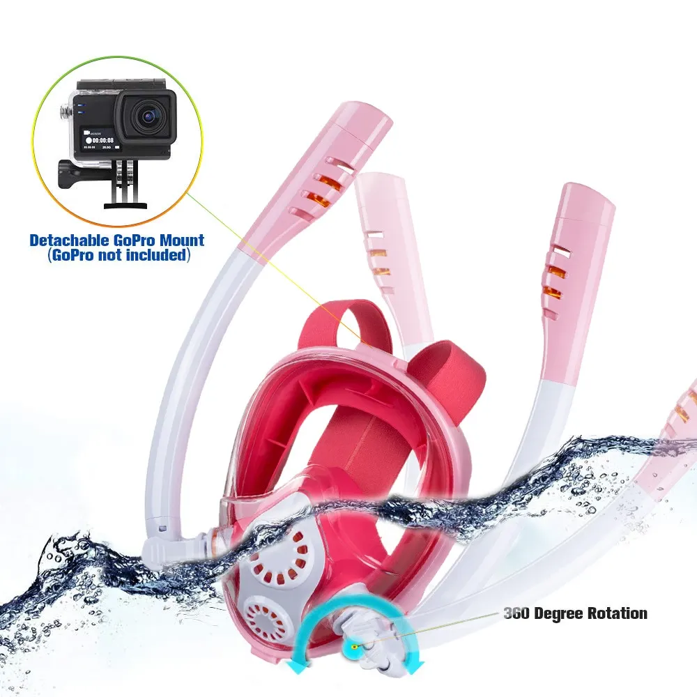 This State-of-the-art full-face snorkeling mask has a patented respiratory system with dual breathing tubes, which separates expiration from