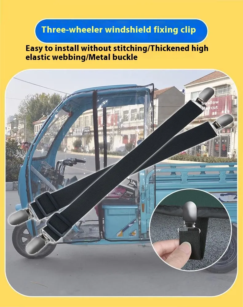 Secure your rain curtains or canopy covers effortlessly with this set of 4 elastic stainless-steel fixing clips, ideal for electric tricycles and small vehicles. Designed for easy attachment, these clips keep fabric panels tightly in place even during wind or motion.