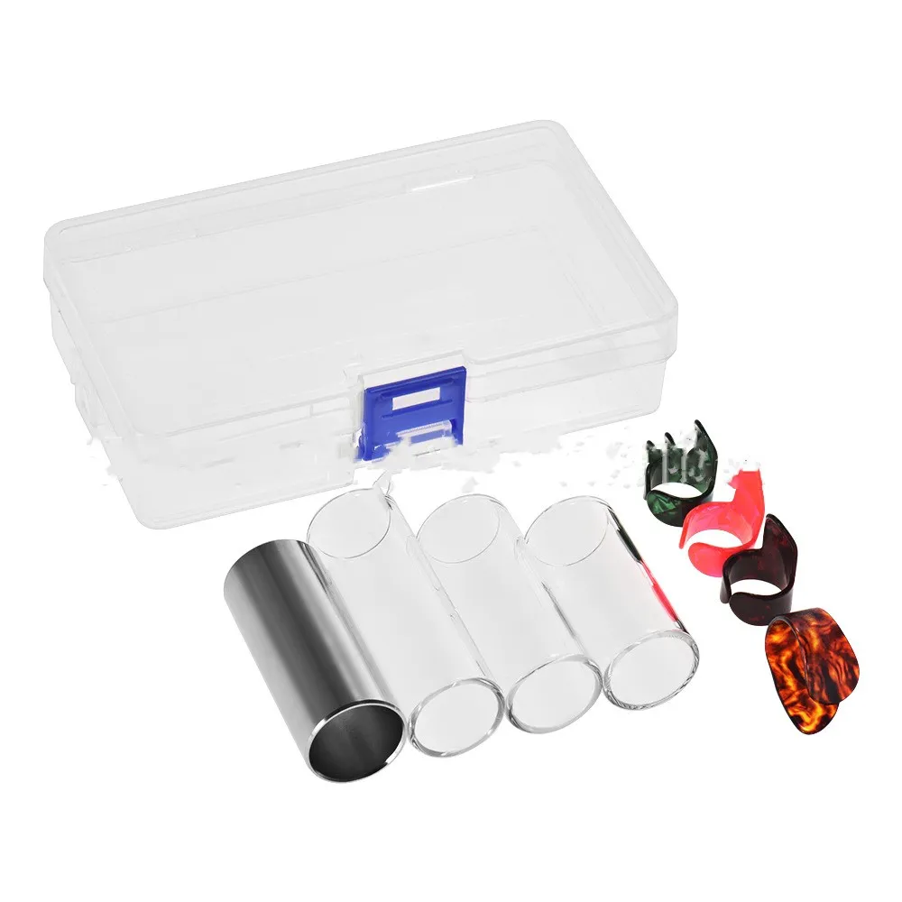 1 * Stainless steel sliding rod; 3 * Glass slider; 4 * SELLU finger pick (random color); 1 * Plastic box;
