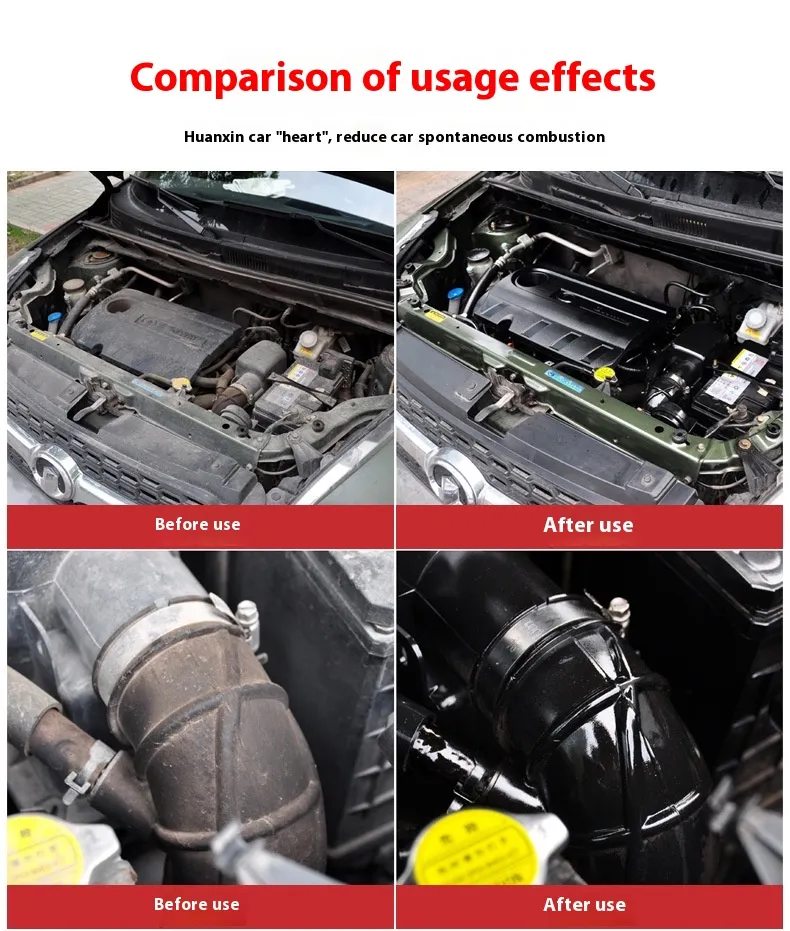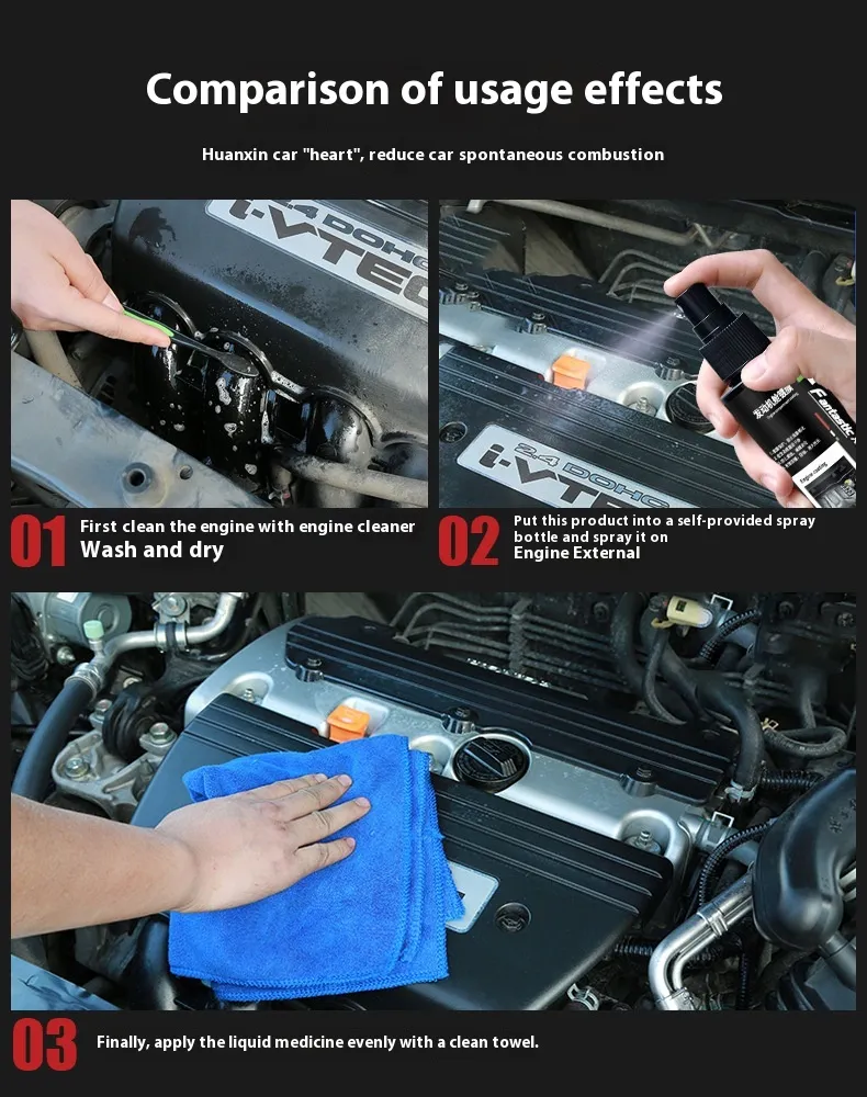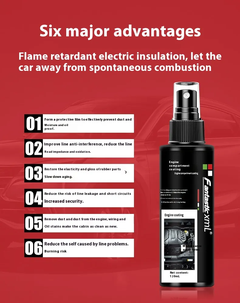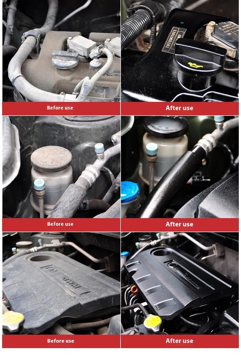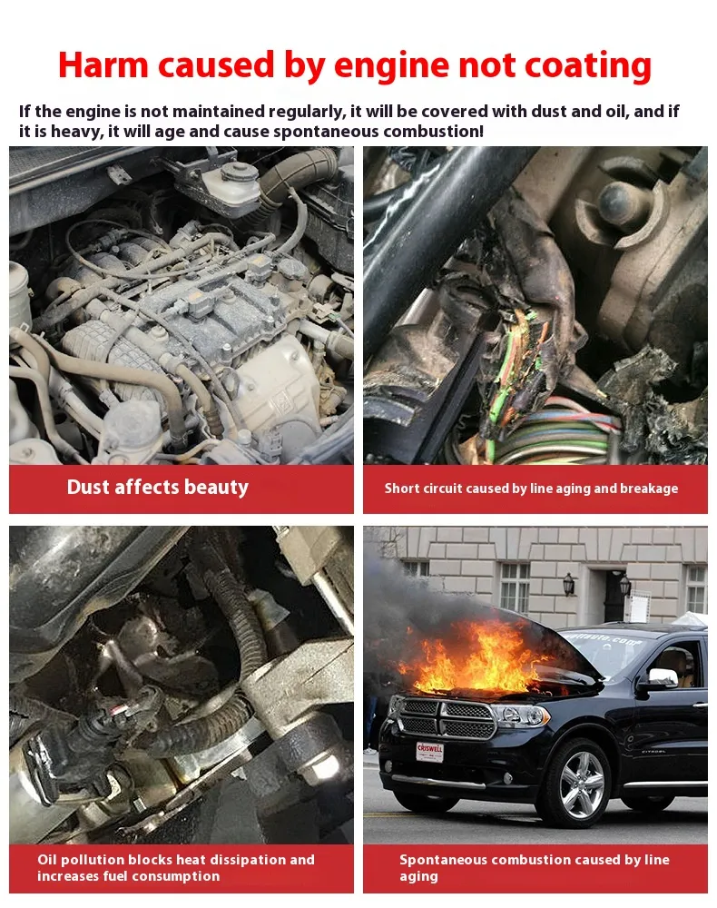 Additionally, it cleans and maintains engine surfaces, removing dust and oil to restore the cabin and engine area to a like-new condition. By protecting wires and components, it also reduces the risk of spontaneous combustion caused by faulty or degraded wiring. Perfect for automotive maintenance and preventative care.