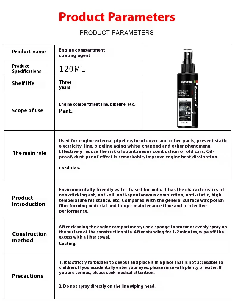 Protect and maintain your engine with this 120ml Engine Coating Agent, specially formulated to form a durable protective film against dust, moisture, and oil. It helps safeguard wiring and engine components, enhancing performance and longevity.