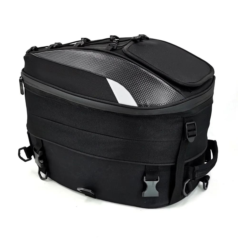 Upgrade your riding gear with this expandable motorbike tail pack, designed for both short commutes and long-distance touring. Made with carbon fiber PU leather and Oxford cloth, it combines toughness with a sleek finish, ensuring durability and style.