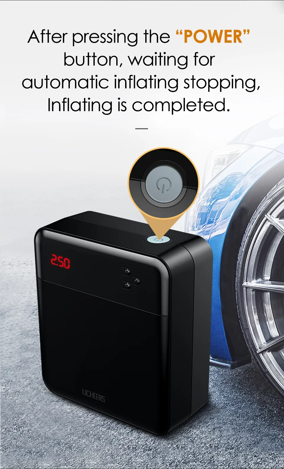 Powered by a DC12V cigarette lighter socket, the pump includes a 3-meter power cord, giving you easy access to all four tires. The digital display offers accurate pressure readings, while the auto-stop function ensures the inflator shuts off automatically once the desired pressure is reached — preventing over-inflation and saving energy.