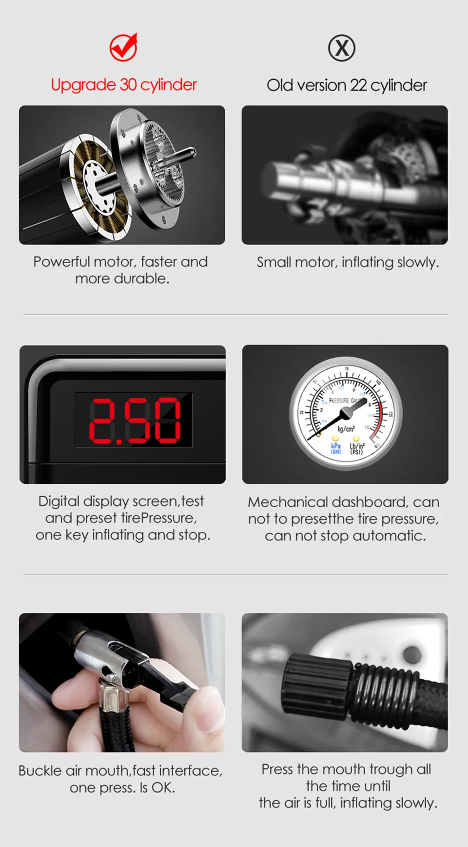 Powered by a DC12V cigarette lighter socket, the pump includes a 3-meter power cord, giving you easy access to all four tires. The digital display offers accurate pressure readings, while the auto-stop function ensures the inflator shuts off automatically once the desired pressure is reached — preventing over-inflation and saving energy.