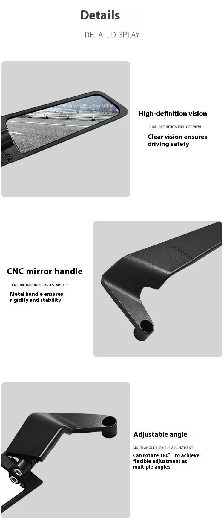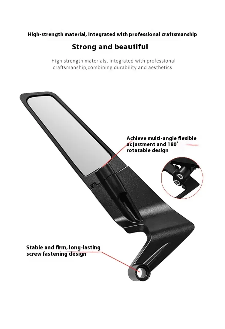 Crafted from high-quality aluminum alloy, the FlexiView mirrors combine lightweight strength with long-lasting corrosion resistance. The foldable design allows easy adjustment and space-saving storage, making them ideal for urban and long-distance riders alike.