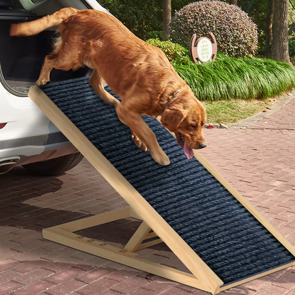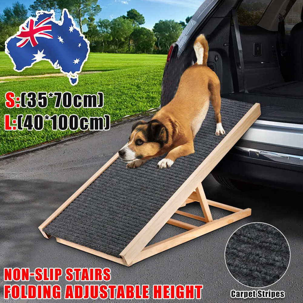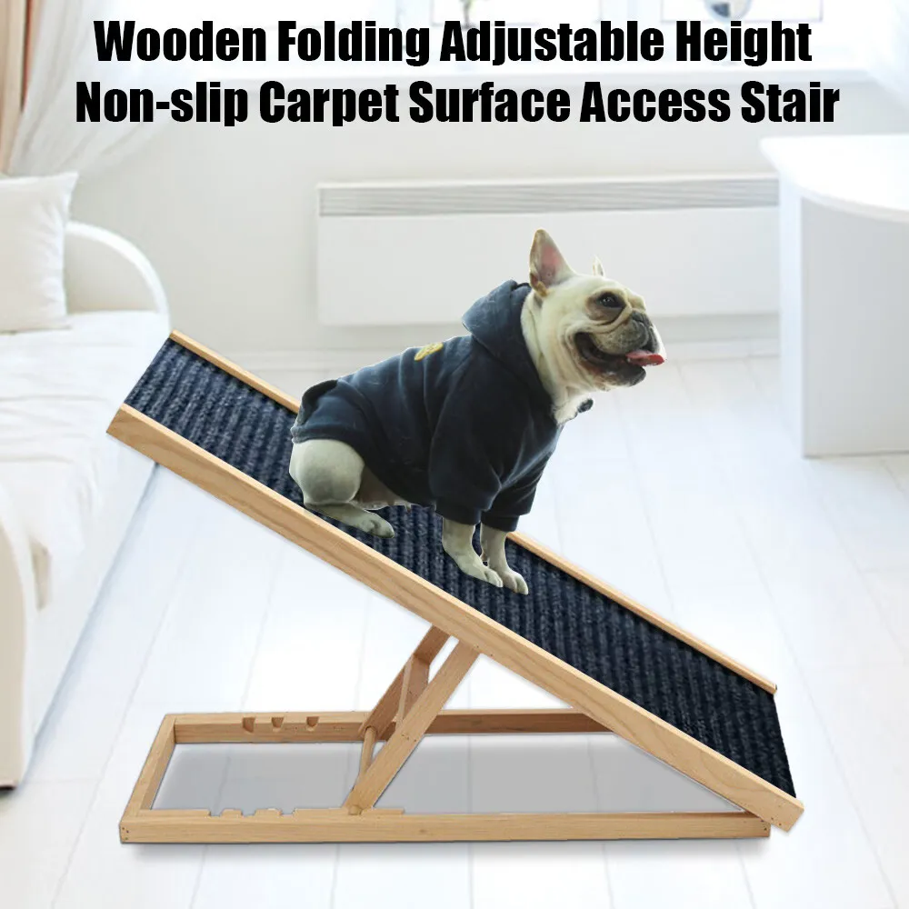 Foldable Dog Pet Ramp Adjustable Height for Cars BedsHelping your pet get around shouldn’t feel like a daily struggle. This Foldable Dog Pet Ramp takes the pressure off joints while giving your furry mate safe, steady access to beds, sofas, cars, and even caravans. Built with a sturdy timber frame and a paw friendly carpet surface, it offers reliable grip and confidence for pets that hesitate around heights. And since it’s adjustable, you can tweak the incline to suit anything from a low lounge to a higher vehicle boot. It’s a simple addition that makes a big difference, especially for ageing dogs or those recovering from injury. Key Features and BenefitsA solid ramp isn’t just about getting from point A to point B. It’s about comfort, safety, and peace of mind. This ramp uses a non slip carpet surface that gives your pet traction under their paws. That matters when they’re climbing at an angle, especially if they’ve got reduced mobility or weaker hind legs. Slips can lead to further injury, so that textured surface plays a bigger role than you might expect. Height adjustability adds another layer of flexibility. You’re not stuck with one angle. Instead, you can match it to your car boot, bed frame, or couch height. That gradual incline reduces strain on hips, knees, and spine, which is particularly important for breeds prone to joint issues like dachshunds or older labradors. And if you’ve got more than one pet, it works across different sizes too. Portability is another standout. The foldable design means you can pack it into your car for weekend trips or store it neatly at home without clutter. The metal hinge keeps it sturdy while still allowing smooth folding. No fiddly parts, no assembly headaches, just open it up and you’re sorted. The timber construction using marine plywood and pine adds durability without making it overly heavy. It can handle pets up to 45 kilograms, so it’s not just for tiny companions. Rubber stoppers on the base keep it stable on tiles, timber floors, or even outdoor surfaces like decking. That stability makes a noticeable difference when your pet is halfway up and relying on it. And for pets recovering from surgery or dealing with arthritis, this ramp provides a gentler alternative to stairs. Instead of lifting their body weight in steps, they can walk up a steady incline, which feels far more natural. Who Is This For?This ramp fits into everyday Australian life more easily than you might think. If you’ve got an older dog who used to jump into the ute without thinking twice but now hesitates, this is a practical fix. It helps them stay independent without you having to lift them every time. It’s also a smart pick for pet owners with smaller breeds. Think cavoodles, French bulldogs, or miniature schnauzers who struggle with higher furniture. You’ll notice they start using the ramp quickly once they feel secure on it. And then there are households with active lifestyles. If you’re heading off on road trips along the coast or loading up for a camping weekend, having a portable ramp makes life easier. No more awkward lifting or worrying about your dog slipping on metal car surfaces. Just set it up and let them walk in. What’s Included and SpecificationsYou’re getting a fully assembled ramp, ready to go straight out of the box.