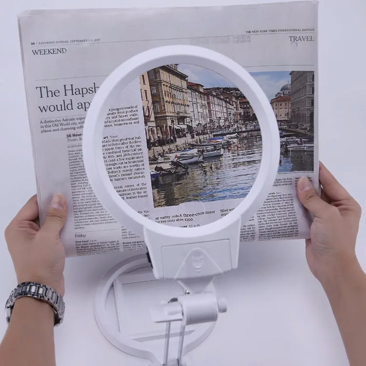 This magnifier features a large 130mm lens with 2.5X magnification and a smaller 25mm lens with 5X magnification, allowing you to switch between wider views and detailed close-ups. Equipped with two LED lights, it ensures bright and clear visibility even in low-light environments. Powered by three AAA batteries (not included), it is energy-efficient and convenient for extended use.