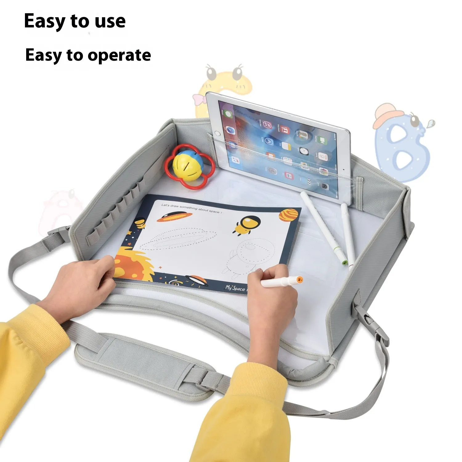 Designed for portability and convenience, this tray can be easily attached to car seats and removed when not in use. Perfect for family trips, school rides, or outdoor excursions, it enhances safety, organization, and entertainment during travel, providing a multifunctional solution for children and adults alike.
