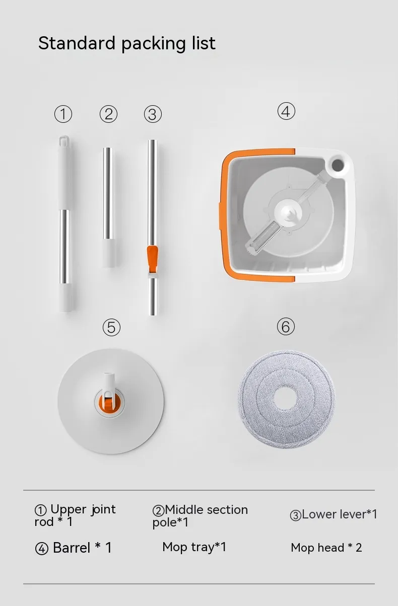 Upper pole * 1 Middle section pole * 1 Lower pole * 1 Bucket * 1 Mop tray * 1 Mop head * 2