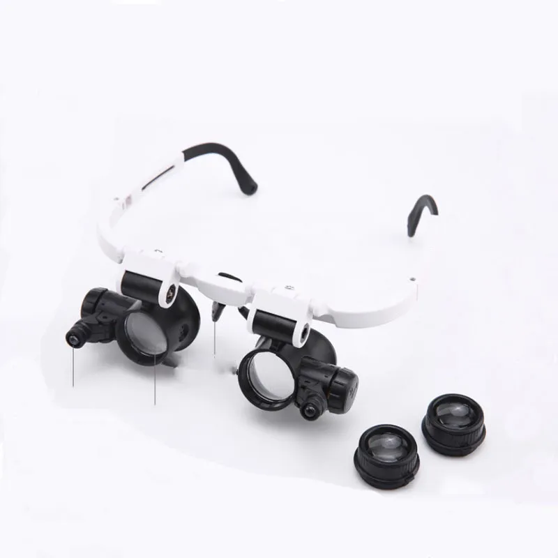 For added functionality, the glasses feature dual LED lights powered by six LR1130 batteries, providing bright illumination to enhance visibility in low-light environments. With its comfortable head-mounted design, hands-free operation, and adjustable lighting, this magnifier is the perfect companion for detailed maintenance and precision tasks.