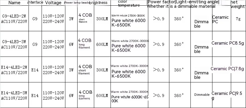 Light color: G 9 220v White, G 9 220v warm White, E 14 220v White, E 14 220v warm White