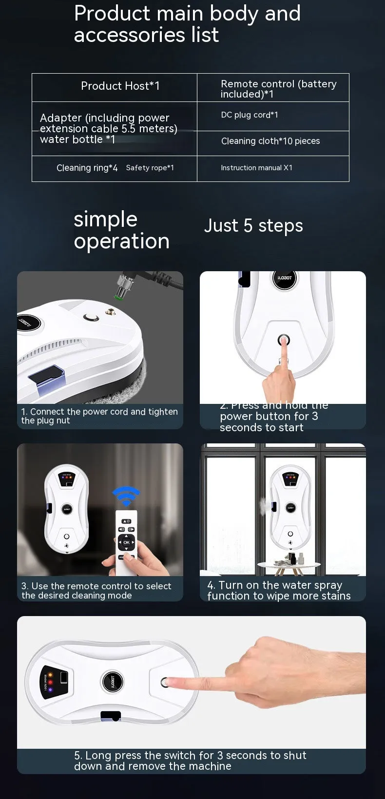 Designed for ease of use, the Intelligent Water Spray Window Cleaning Robot includes a remote control (with battery) for effortless operation. The robot’s intelligent spray mechanism and cleaning cloths ensure an effective and thorough clean, while the included safety rope provides extra security for high or hard-to-reach windows. With accessories such as a cleaning ring, water injection bottle, and 10 cleaning cloths, this robot offers everything you need for a complete window cleaning experience.