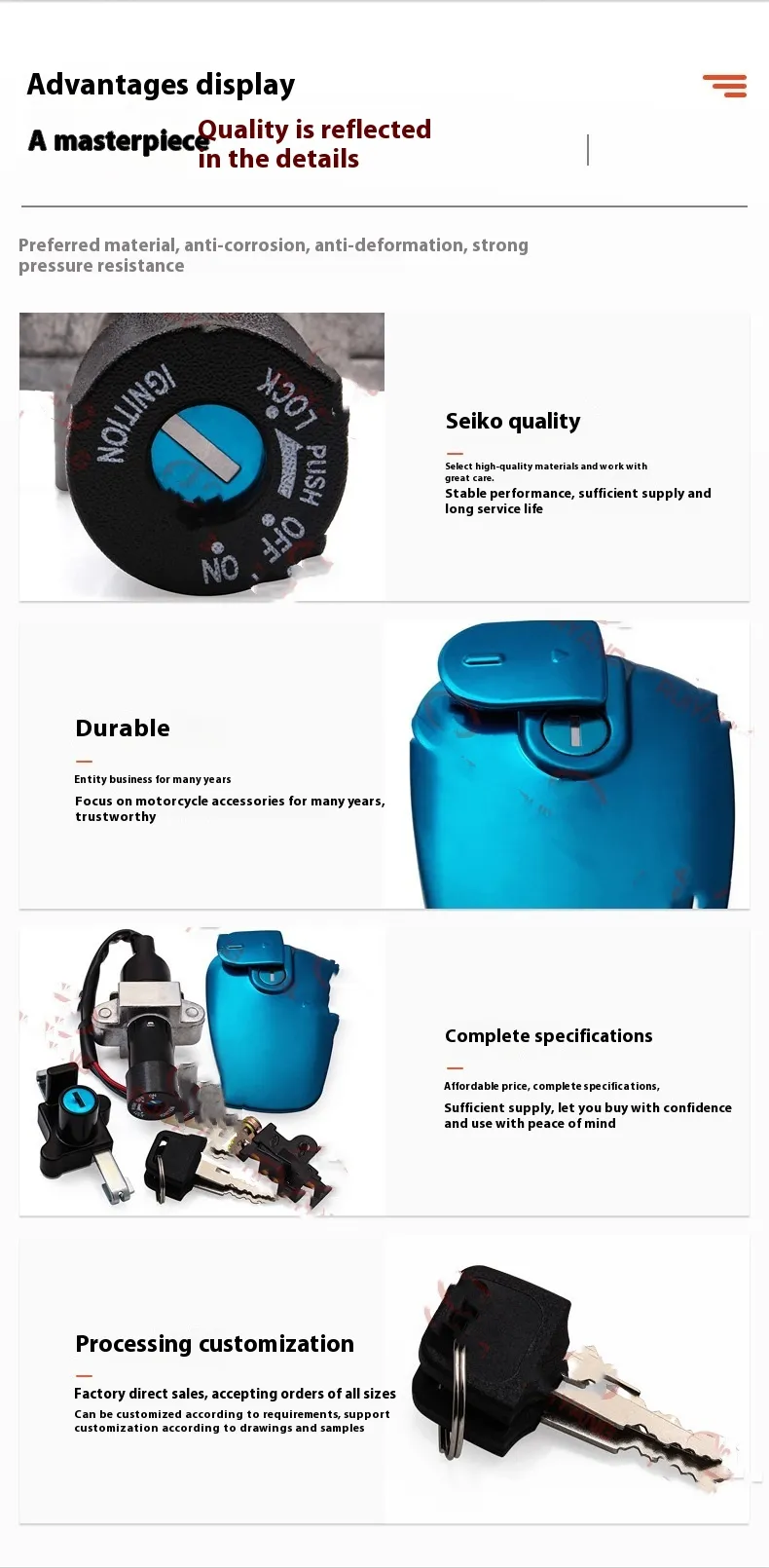 Crafted with durable materials, the RY-0382 lock set offers long-lasting performance against wear and tampering. Itβs designed to integrate seamlessly with your bikeβs locking mechanism, providing smooth functionality and dependable safety whether youβre on the road or parked outdoors.