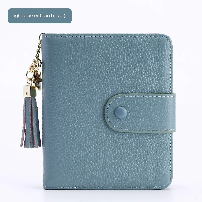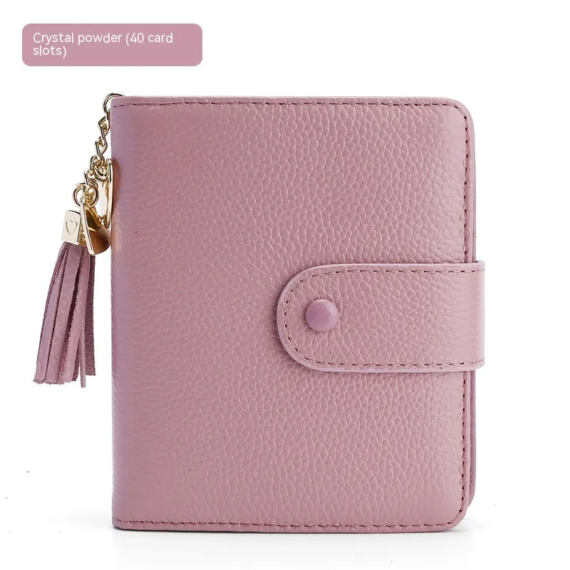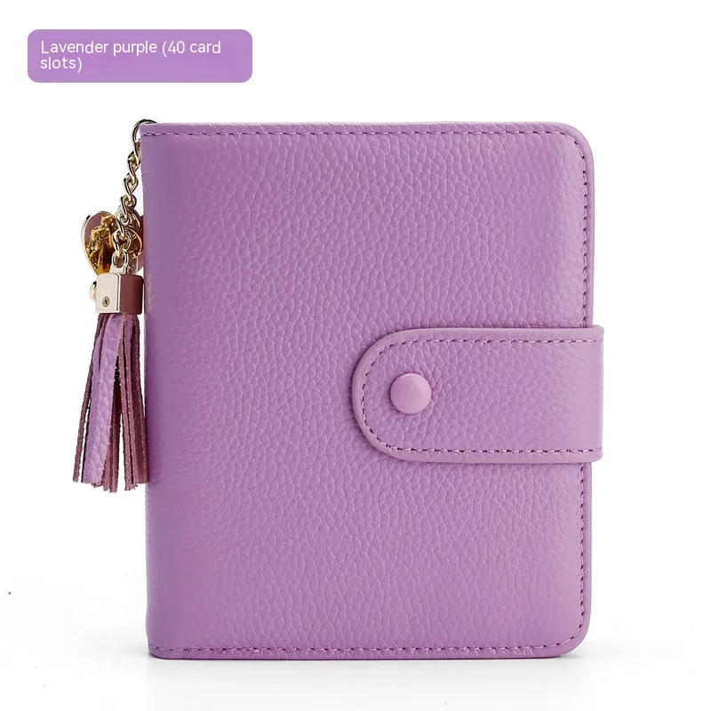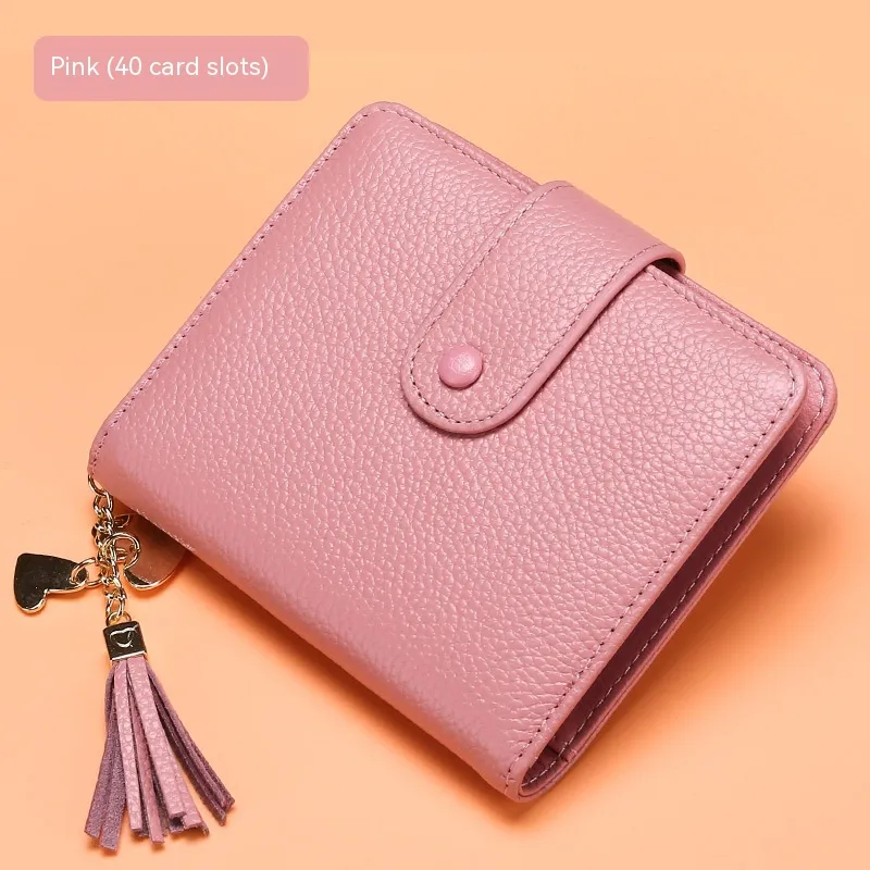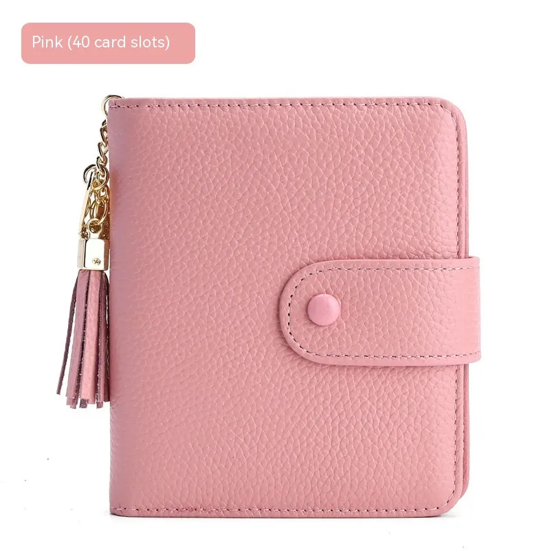Korean Style Cowhide Card Holder – 40-Slot Tassel Snap Wallet