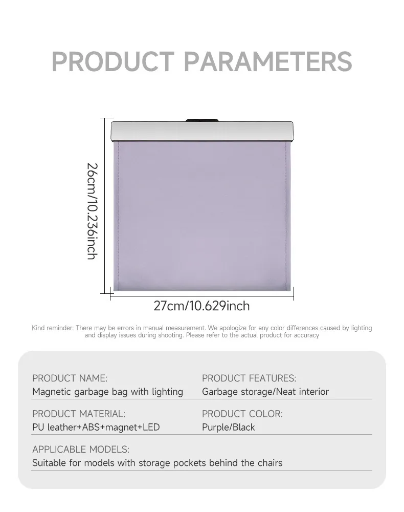 Crafted from high-quality leather, this garbage bag is durable, waterproof, and easy to clean. The magnetic attachment system allows effortless installation on any metal surface, while the LED light ensures visibility at night or in low-light conditions. Available in black and purple, it combines functionality with a touch of personalized style.