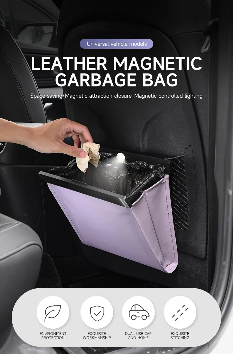 Leather Car Garbage Bag with LED Light & Magnetic Hanging Feature