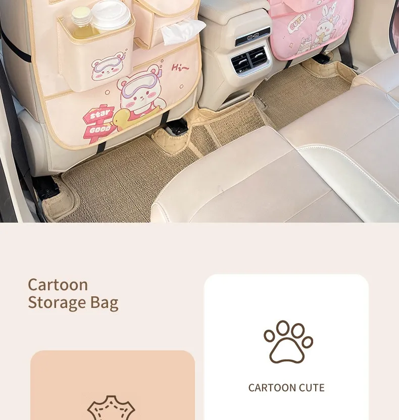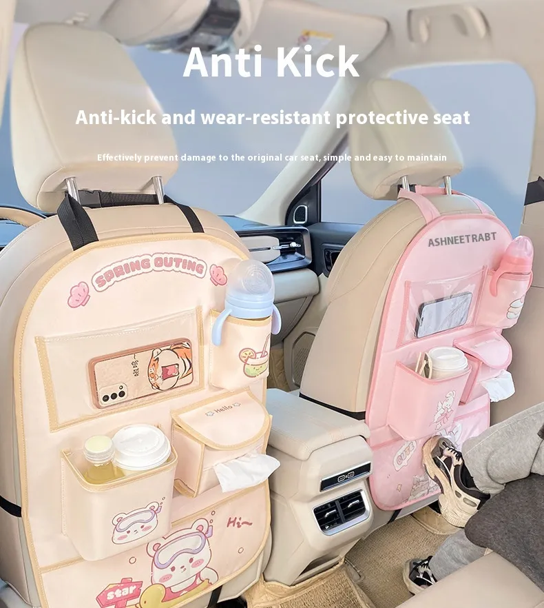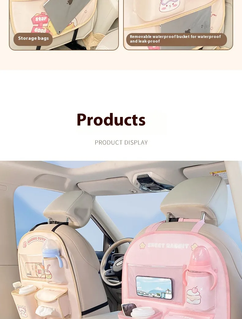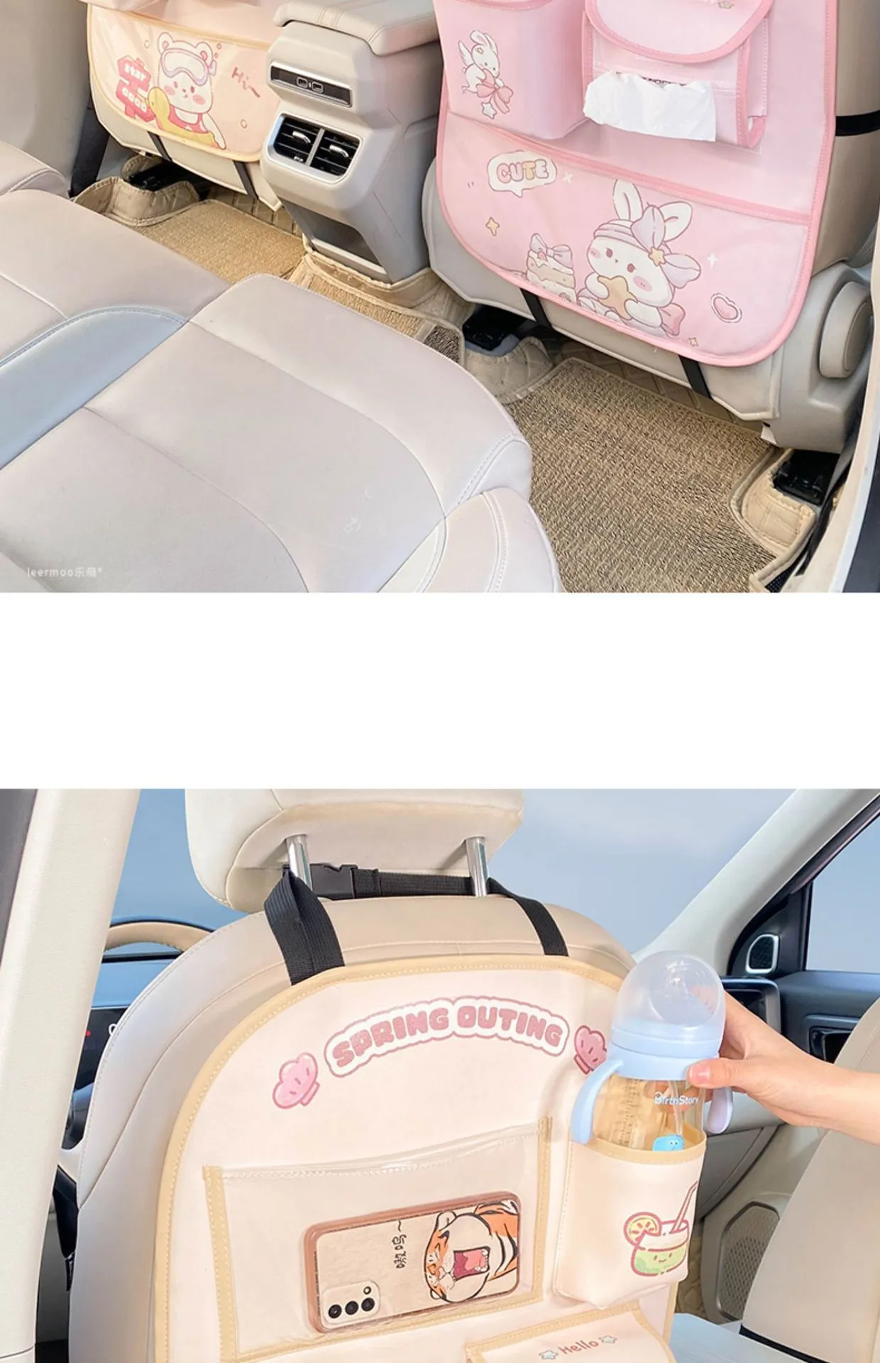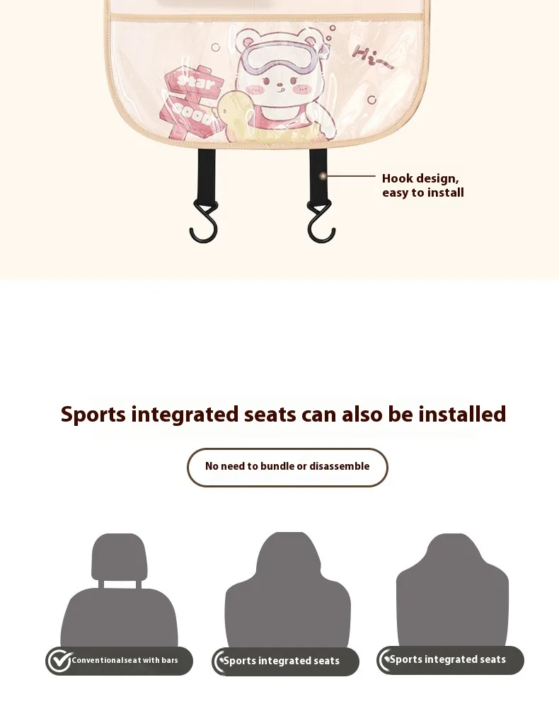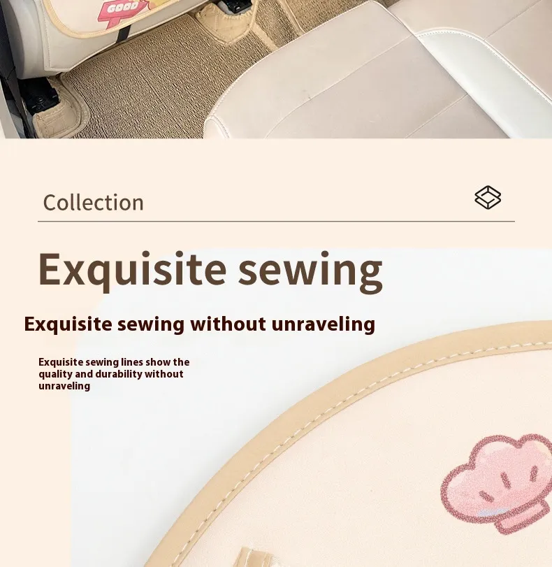 Crafted from high-quality leather, it is durable, waterproof, and easy to clean—just wipe with a damp cloth. The anti-kick design keeps your car interior tidy while built-in storage pockets hold toys, tissues, snacks, or small accessories. Choose from adorable designs like the Color Bear or Rabbit, making your backseat both functional and fun.